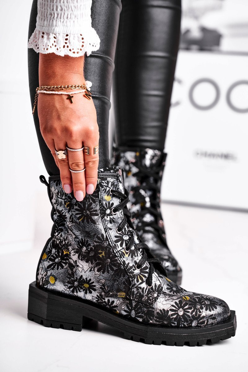 Maciejka sa svojimi výrobkami vždy vyznačovala. Najnovšia zbierka topánok je potvrdenie! Horná časť z prírodnej kože zdobená krásnymi striebornými kvetmi. Klasické šnurovanie a zips na vnútornej časti hornej časti. Trapper, Square Sole vyzerá úžasne a určite vynikne! Pri výbere veľkosti navrhnite tabuľku veľkosti.