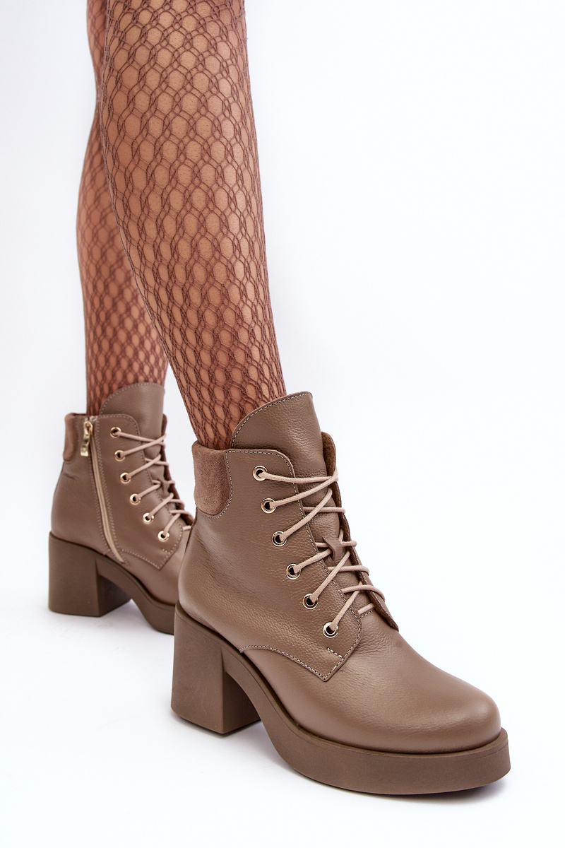 Dámske členkové topánky. Vyrobené z vysoko kvalitnej prírodnej kože. Podpätky zabudované vo forme príspevku. Vo vnútri izolovanej s obuvou prikrývkou. Model pripevnený posúvačom na strane hornej časti a navyše má šnurovanie. Stred je mierne izolovaný s obuvou prikrývkou. Päta v tejto obuvi je stuhnutá. Zaoblené prsty na nohách. Pri výbere veľkosti postupujte podľa tabuľky veľkosti.