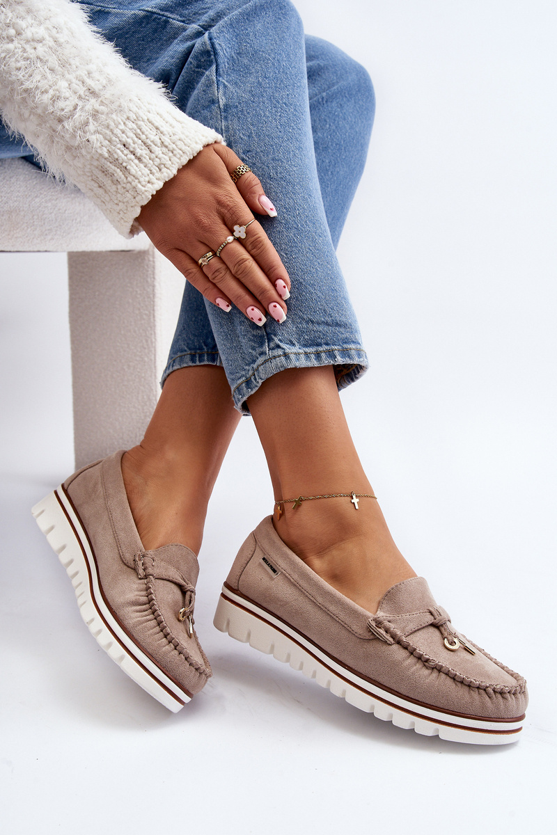 Dámske mokasíny vyrobené z ekologického semišu. Umiestnené na platforme. Zaoblené špičky. Tento model má mäkkú stielku z pravej kože, ktorá zabezpečí pohodlie počas nosenia. Vpredu malé zavesené ozdoby. Klasický strih, ktorý môžete kombinovať s mnohými jarne letnými štýlmi! Při výběru velikosti se řiďte tabulkou velikostí.