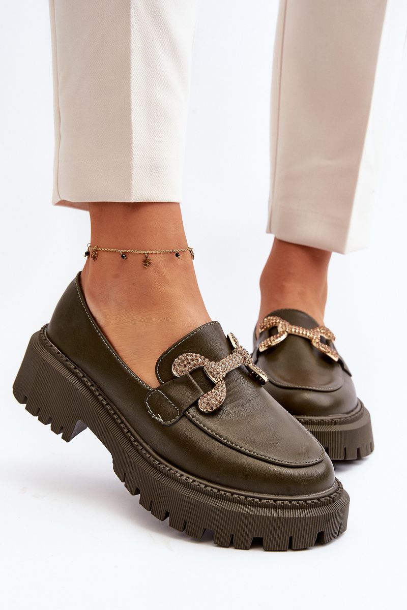 Dámske mokasíny vyrobené z ekologickej kože. Vsadené na masívnu, plochú podrážku a hrubú podrážku. Tento model má zaoblené špičky a zlatú ozdobu zpredu. Určite by ste ich mali mať vo svojej skrini! Při výběru velikosti se řiďte tabulkou velikostí.