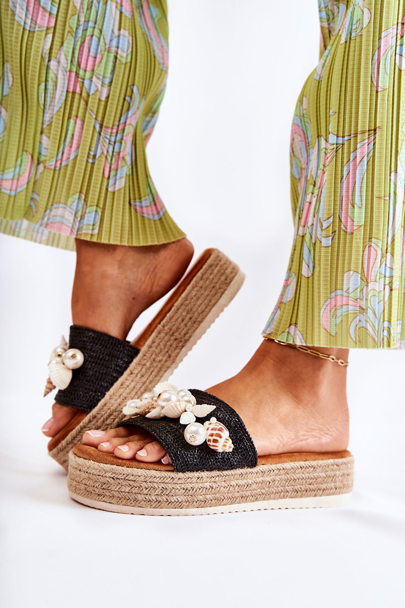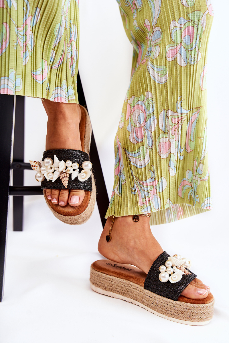 Módne dámske papuče ideálne pre horúce dni! Klasický model, skĺznutý. Boli zabudovaní na masívnej plošine s jutovým copom. Plastová podrážka. Klapky majú mäkkú, ekologickú semišovú vložku. Na popruhu sú dekorácie vo forme škrupín a perly. Pohodlné žabky sú skvelé každý deň! Pri výbere veľkosti navrhnite tabuľku veľkosti. /p>