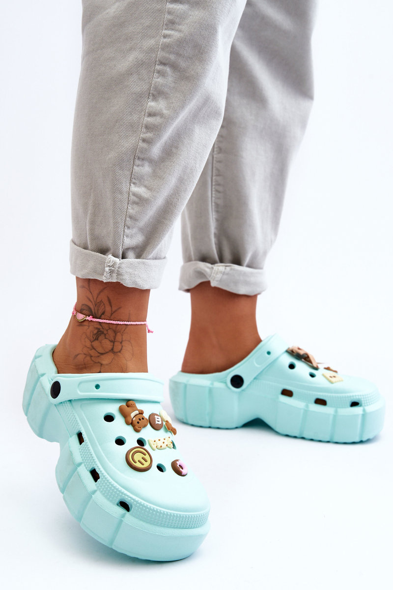 Dámske kroky s očarujúcimi prvkami zdobiacimi zvršok by mali byť vaše! Boli vyrobené z ľahkého plastu peny. Vložka má jemné karty. Pohyblivý popruh chráni pred pohybom chodidla. Topánky boli zabudované na masívne ploché päty a plošinu. Otvory v hornej časti umožňujú správne vetranie obuvi. Pri výbere veľkosti navrhnite tabuľku veľkosti.
