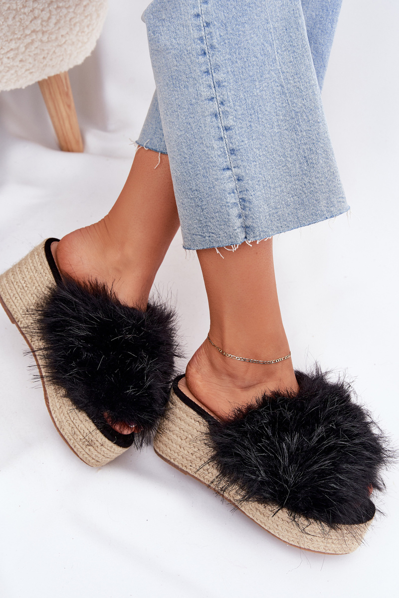 Dámske sandále na klinovom podpätku s kožušinou a pletením čierne Virela