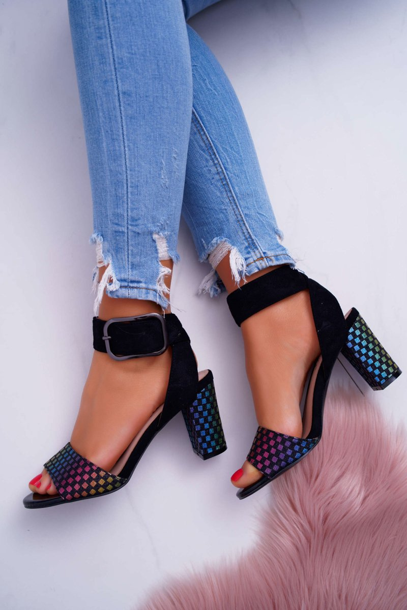 Dámske sandále na semišovom stĺpe čierna geometrická