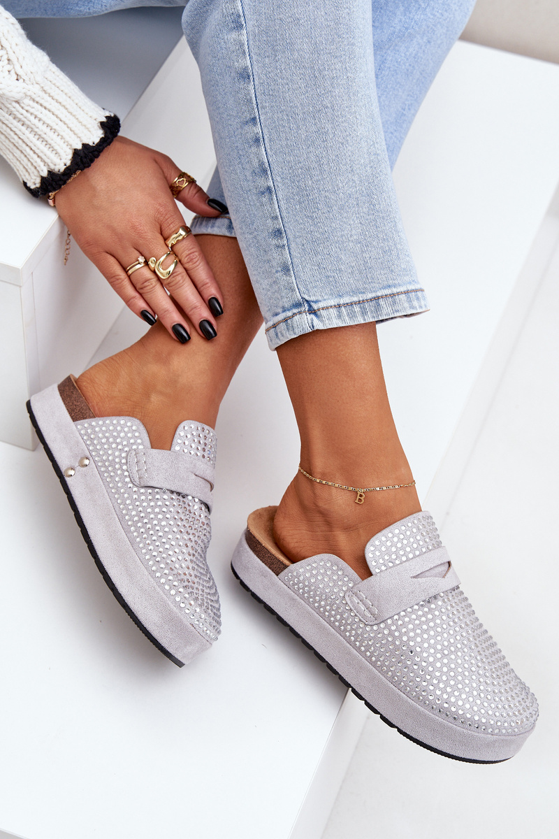 Dámske šľapky z eko semišu. Umiestnené na platforme. Tento model sa vyznačuje mnohými zirkónmi, ktoré dodávajú lesk každej stylizácii. Zakryté, zaoblené prsty. Jemne profilovaná stielka zabezpečuje pohodlie. Štýlový model, ktorý určite doplní mnoho letných stylizácií! Při výběru velikosti se řiďte tabulkou velikostí.