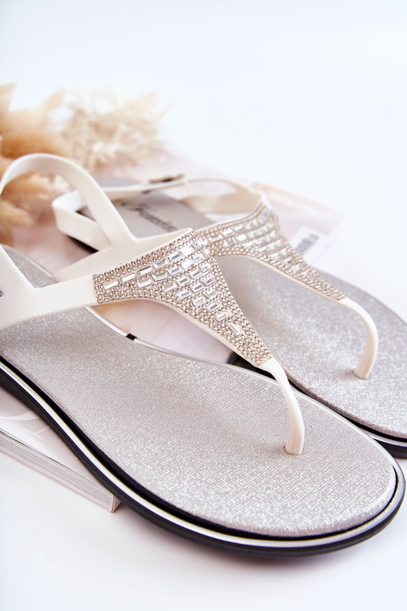 Dámske sandále sú perfektnou obuvou pre horúce dni! Model japonského štýlu. Tieto topánky boli vyrobené výlučne z gumového plastu. Na popruhoch sú krásne kamienky napodobňujúce kamienky. Pripevnené sponou s nastaviteľným popruhom. Tieto sandále sú umiestnené na plochej päte s podrážkou, ktorá nie je k dispozícii. Tento neobvyklý model by mal byť vo vašom šatníku! Pri výbere veľkosti postupujte podľa tabuľky veľkosti.