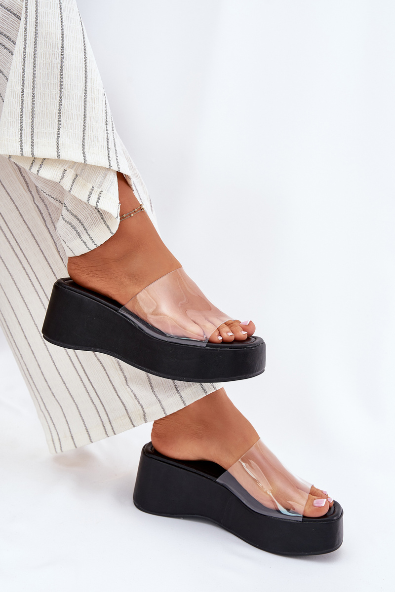 Dámske sandále s priehľadným pásikom na klinovom podpätku čierne Meltiana
