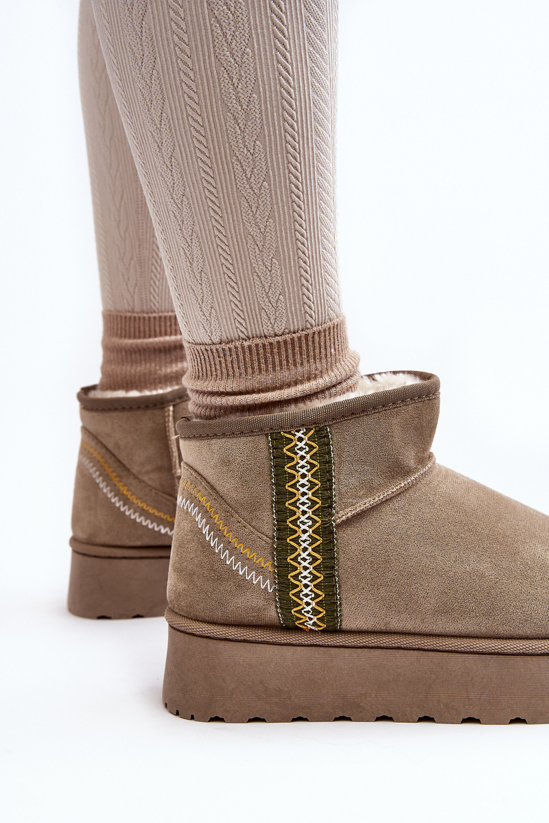 Dámske snehové topánky s módnym vzorom na zvršku. Izolovaný s hrubou syntetickou kožušinou vo vnútri. Vyrobené z ekologického semišu. Zaručené na masívnej plošine vyrobenej z gumového plastu. Členok zvršok. Ideálne pre jesenné a zimné štylizácie! Tento model sa vyskytuje aj vo veľkostiach detí. Vytvorte set mamu + dieťa! Pri výbere veľkosti navrhnite tabuľku veľkosti. p>