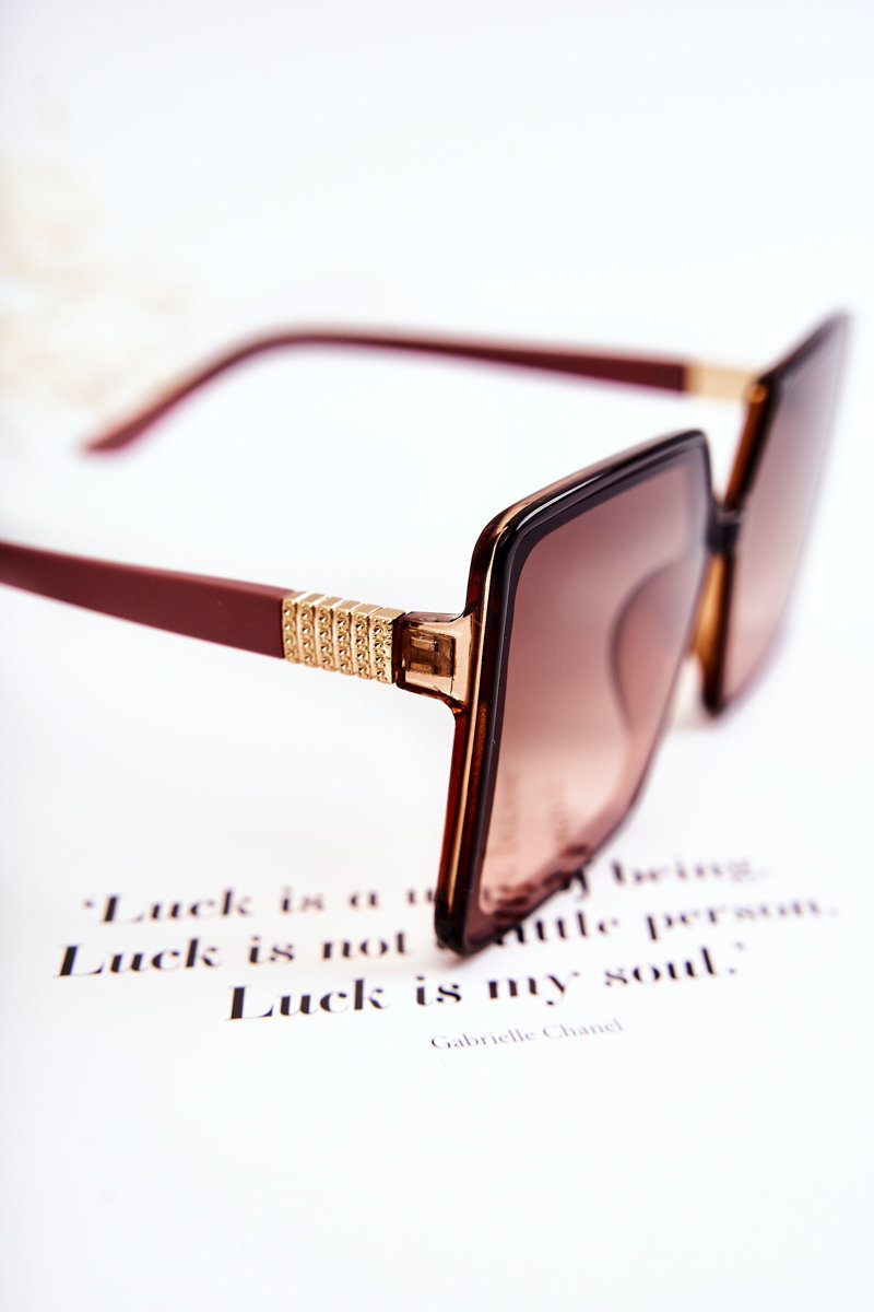 Unikátne a štýlové slnečné okuliare sú v mnohých situáciách skvelé! Nielen počas letnej sezóny, ale aj zimy, keď sa slnečné lúče odrazia od snehu. Model s veľkým štvorcovým tvarom s tenkými rámami šošovky. Most vyrobený z plastu. Plastové chrámy sú dodatočne zdobené zlatým doplnkom. Informácie od výrobcu: okuliare absorbujú škodlivé UV lúče, kategória 2.