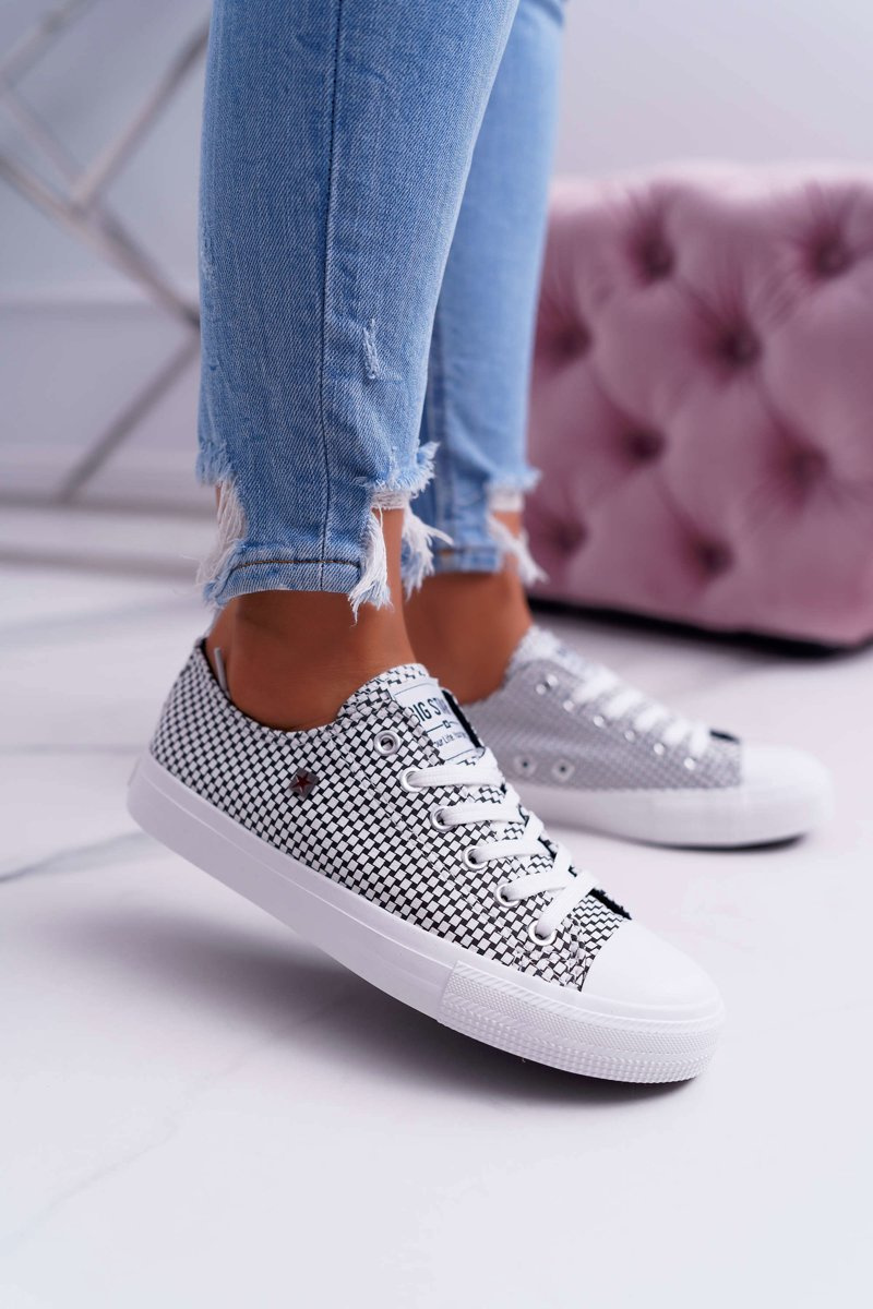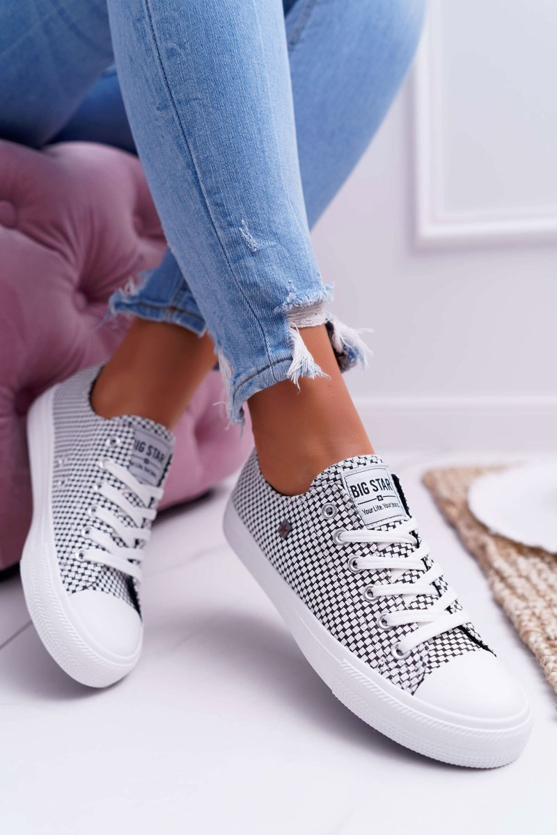 Classic Women's Veľká hviezda tenisky. Známy model s gumovou špičkou a dvoma očami na vnútornej strane topánky. Topánky vyrobené z textilného materiálu zdobené biela a čierna mriežka. Logo Big Star na podrážke. Pri výbere veľkostí postupujte podľa tabuľky veľkosti.