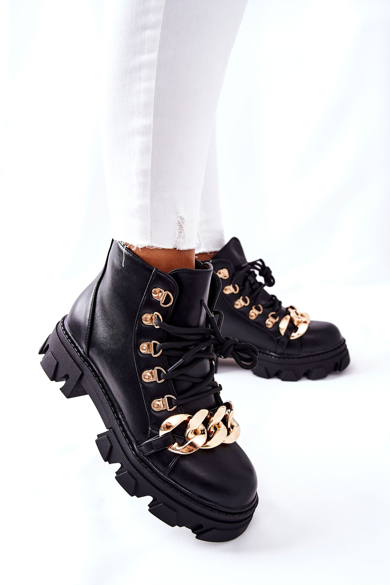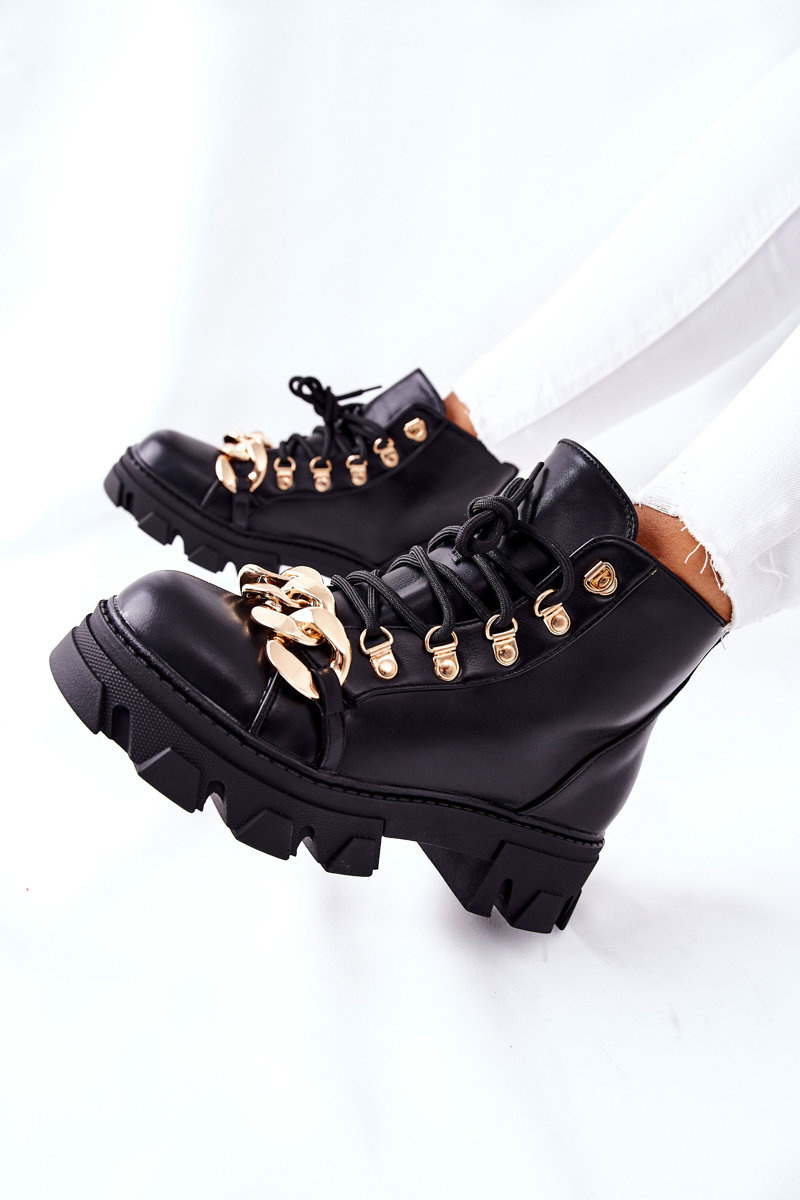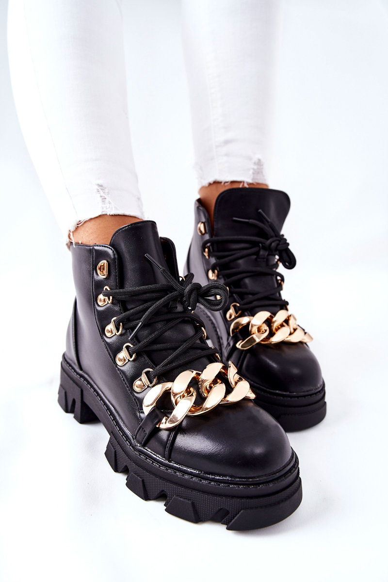 Topánky, ktoré sú neoddeliteľnou súčasťou jesenného a zimného štylizovania. Topánky boli úplne vyrobené z ekologickej kože. Hrubé podrážky a zlaté dekorácie vo forme reťazca a zlatých stehov, vnútorná strana topánky pokrytá jemným zahrievaním vo forme obuvi. Pri výbere veľkosti navrhnite tabuľku veľkosti.