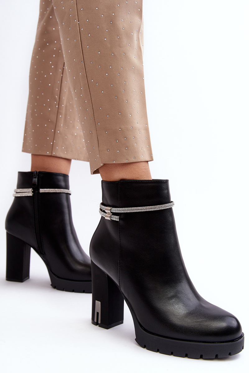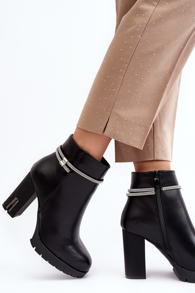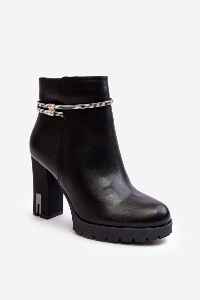 Dámske topánky vyrobené z ekologickej kože. Nastavené na platforme a podpätkoch vo forme príspevku. Tento model je pripevnený posúvačom na strane hornej časti. Zaoblené prsty na nohách. Stuhnutá päta. Mäkká vložka zabezpečí pohodlné použitie obuvi. Horná časť zdobená pásom s malými, lesklými zirkónmi. Ideálne pre jesenné štylizácie! Pri výbere veľkosti navrhnite tabuľku veľkosti. p>