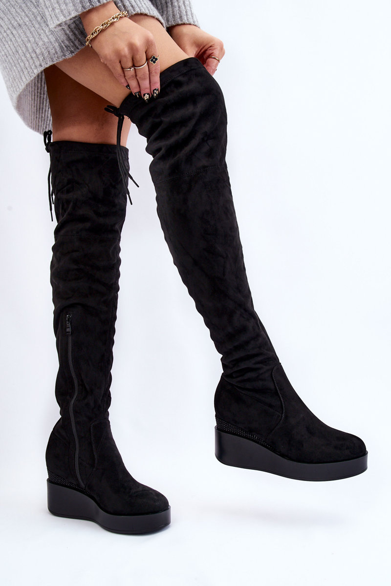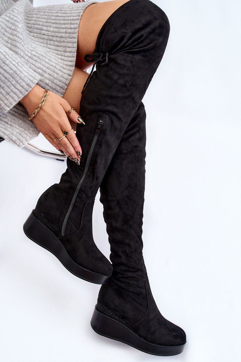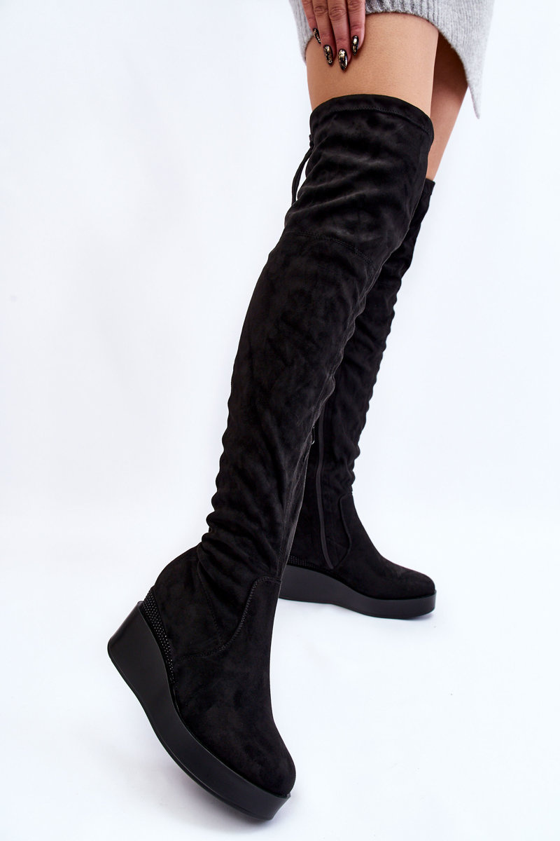 Veľké ženské topánky boli vyrobené z tenkej látky. Vkĺznutý model s ďalším posúvačom na strane hornej časti. Čižmy boli umiestnené na klin a plošinu. Okrem toho boli zdobené tryskami. Päta je stuhnutá. Model cez koleno s väzbou v hornej časti hornej časti. Čižmy majú otepľovanie vo výške chodidla. Pri výbere veľkosti navrhnite tabuľku veľkosti. p>