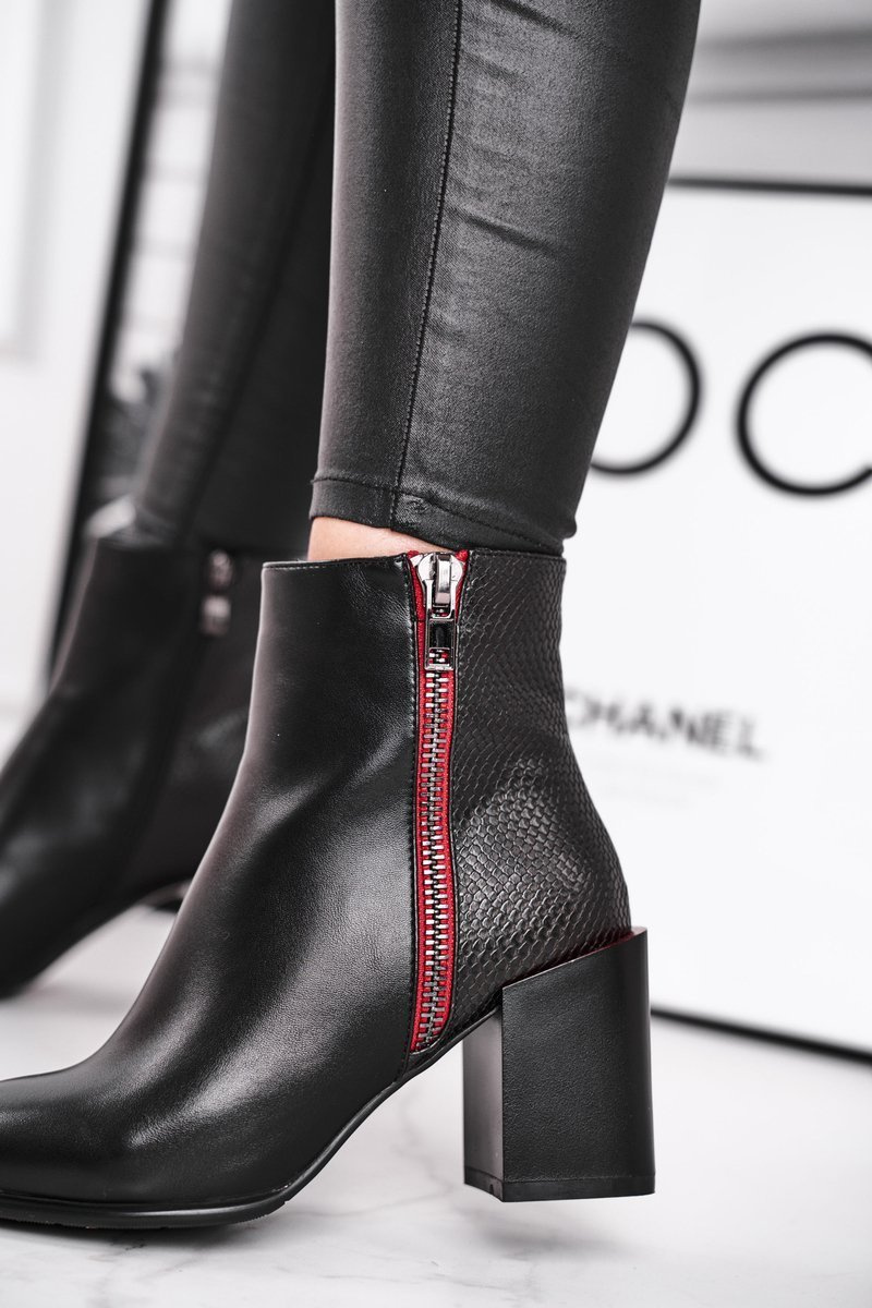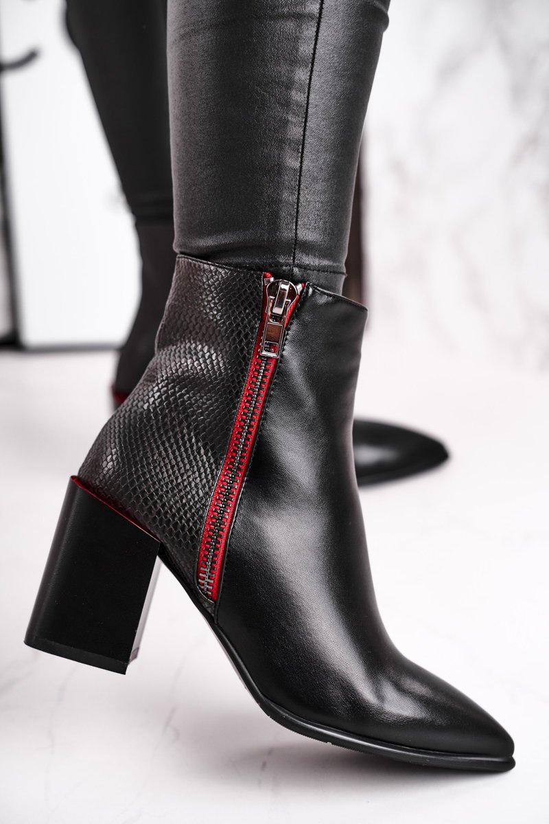Klasické topánky v krásnom strihu. Topánky nastavené v strednej výške so zdobeným stĺpom. Topánky sú úplne vyrobené z ekologických, hladkých a živočíšnych tlače. Na vonkajšej časti hornej časti je veľký posúvač s červeným prízvukom, čo je krásny doplnok. Druhý posúvač nám uľahčí obliekanie. Interiér pokrytý obuvou prikrývkou, ktorá nám v chladnejších dňoch zohriala. Pri výbere veľkosti navrhnite tabuľku veľkosti.