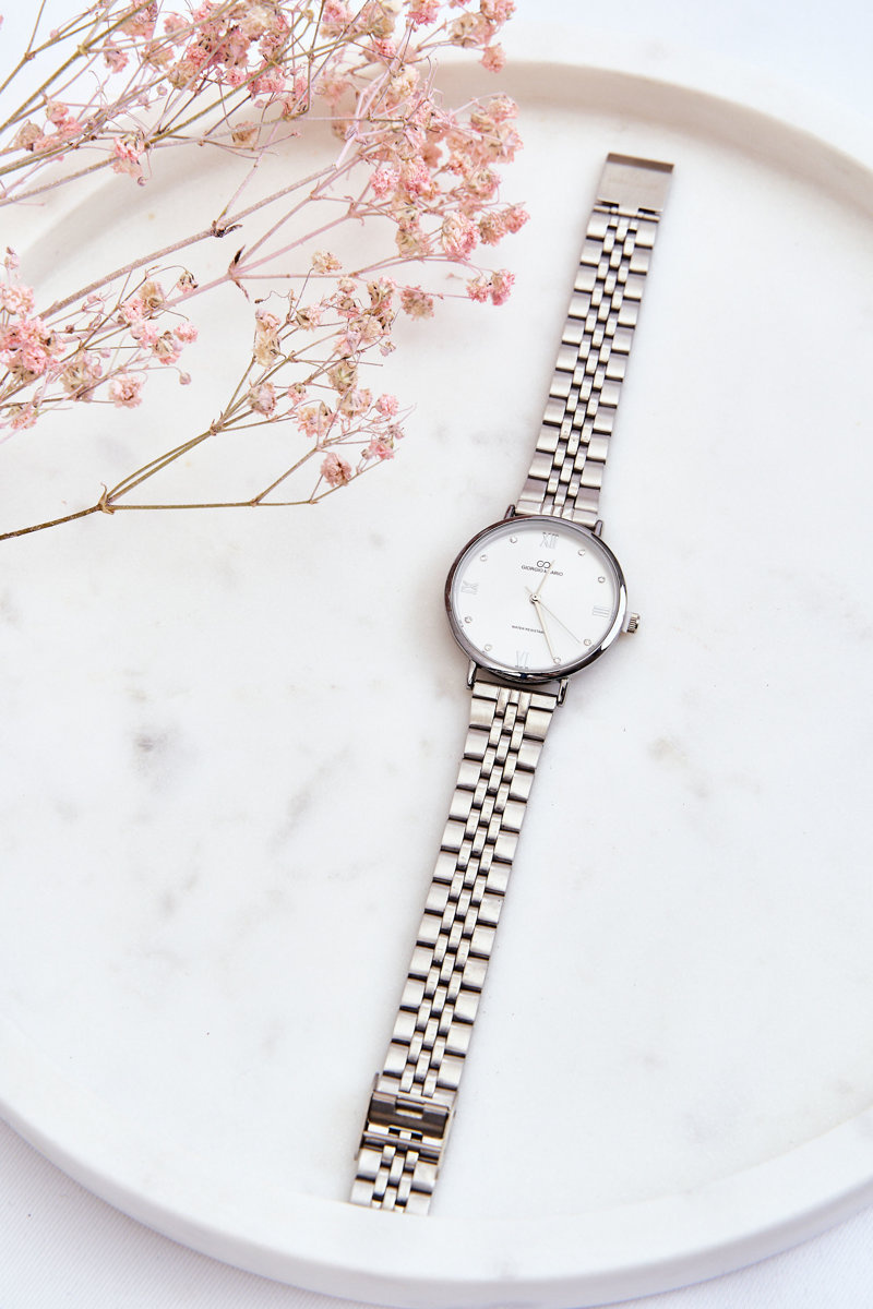 Veľké dámske hodinky vyrobené z nehrdzavejúcej ocele. Okrem toho je vodotesný. Náramok vyrobený z kombinácie menších a väčších odkazov. Hladký štít, s dekoráciami vo forme zirkónia a rímskych čísel. Vďaka nastaviteľnému náramku sa môžete správne vyrovnať hodinkám.