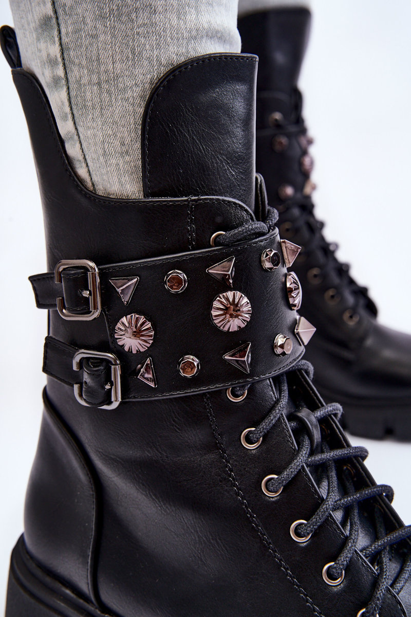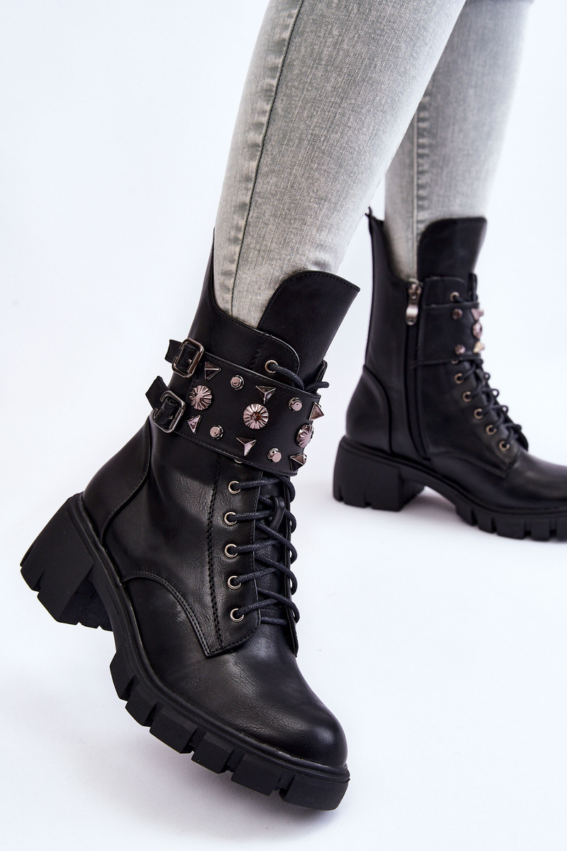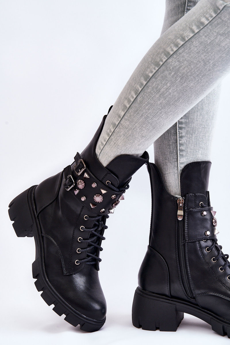 Dámske topánky boli vyrobené z ekologickej kože. Topánky pripevnené posúvačom a priviazané. Klasický model bol umiestnený na plochej päte a platforme. Tieto topánky nemajú otepľovanie. Okrem toho boli zdobené čapmi na svorke. Päta je stuhnutá. Mali by ste ich mať vo svojom šatníku! Pri výbere veľkosti navrhnite tabuľku veľkosti.