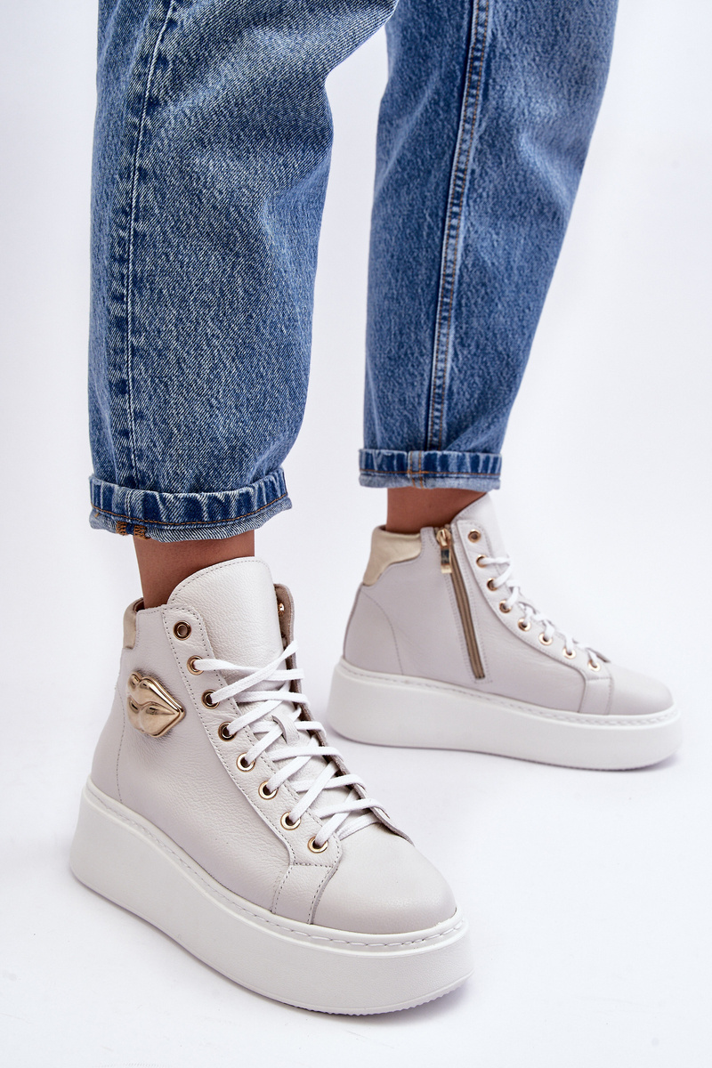 Vysoko dámske tenisky boli vyrobené z prírodnej kože. Majú šnurovanie a upevnenie na strane strany hornej časti. Tento pohodlný model bol nastavený na masívnu platformu. Vložka bola tiež vyrobená z prírodnej kože. Vďaka klasickému vzoru, pohodlnému strihaniu a módnej dekorácii sú tieto tenisky vynikajúce z iných modelov! Pri výbere veľkosti navrhnite tabuľku veľkosti.