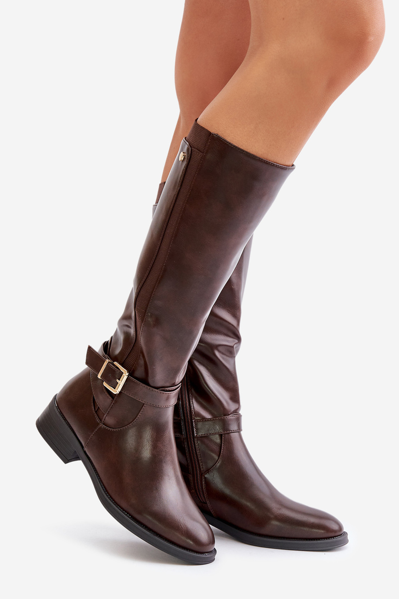 Dámske Zateplené Čižmy Na Ploškom Opätku So Zlatou Sponou Hnedé Arsisna