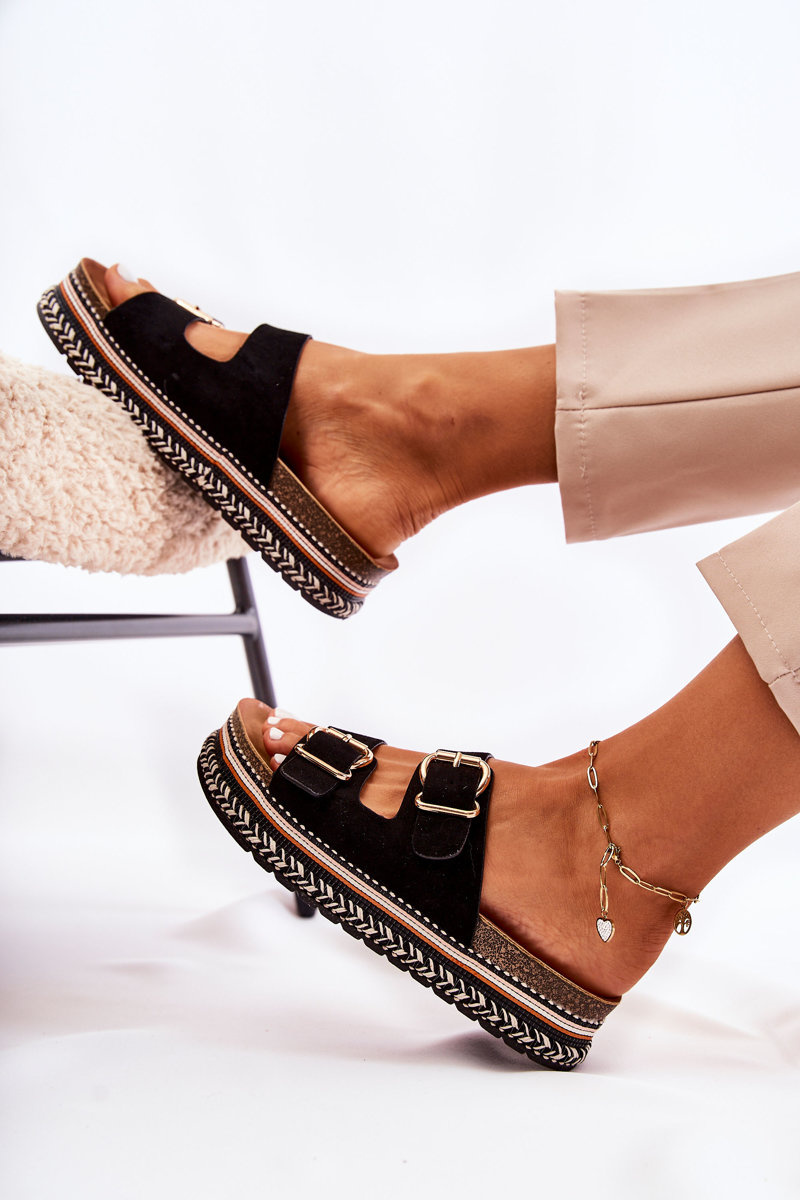Perfektné žabky na letné prechádzky a denné nakupovanie. Tieto klapky majú dva široké prúžky pripevnené do sponky, ktorú je možné nastaviť. Pohodlie a pohodlie použitia zaručené, vďaka profilovanej vložke vyrobenej z ekologického semišu. Platforma je vyrobená z ľahkého plastu, ktorý je dodatočne zdobený vrkočou. Vďaka týmto klapkám je vaše nohy spočívajúce a uvoľnené. Pri výbere veľkosti navrhnite tabuľku veľkosti.