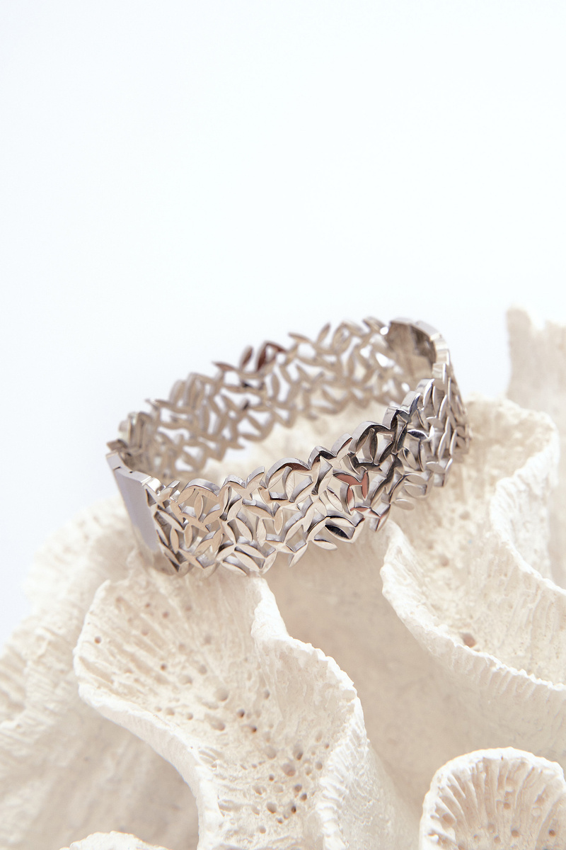 Dámsky náramok vyrobený z nerezovej ocele. Zatvára sa na zatváraciu sponu, čo zaisťuje pohodlné a rýchle nasadzovanie a zobúvanie šperkov. Univerzálny doplnok, ktorý perfektne dopĺňa rôzne štýly a pridáva im nóty elegancie a štýlu.