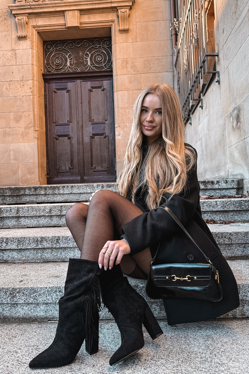 Dámske členkové topánky vyrobené z mäkkej ekologickej semiše. Model na stabilnom opätku typu stĺpik a s úzkymi špičkami krásne predĺži nohy a pridáva siluete ľahkosť. Rázovitá vyšší časť a ozdobné strapce dodávajú celku jedinečný, štýlový charakter. Topánky sa zapínajú na zips, čo uľahčuje ich obúvanie. Vnútro s teplým podšívkou zabezpečuje teplo a pohodlie v chladnejších dňoch. Ideálna voľba pre ženy, ktoré radi kombinujú pohodlie s trochou boho elegancie — výborne sa hodia k nohaviciam aj šatám.