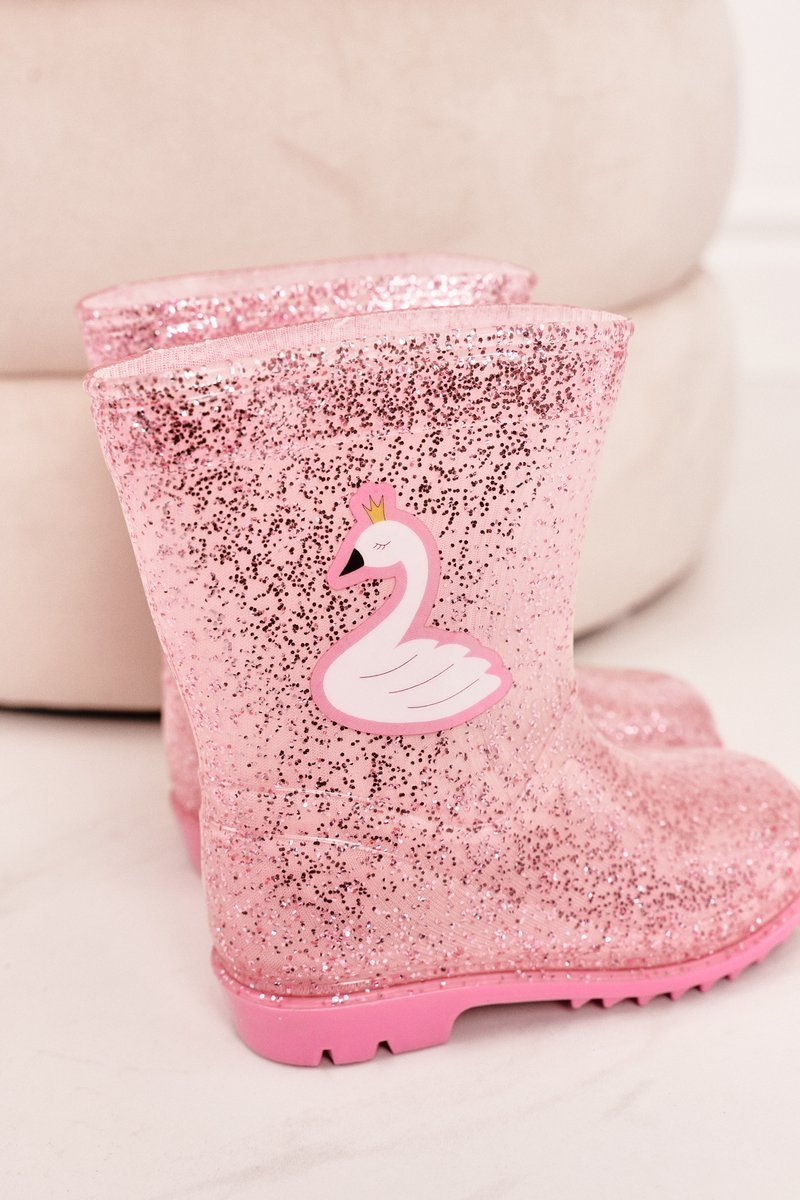 Detské brokátové galoshes s labuťmi ružovou farbou