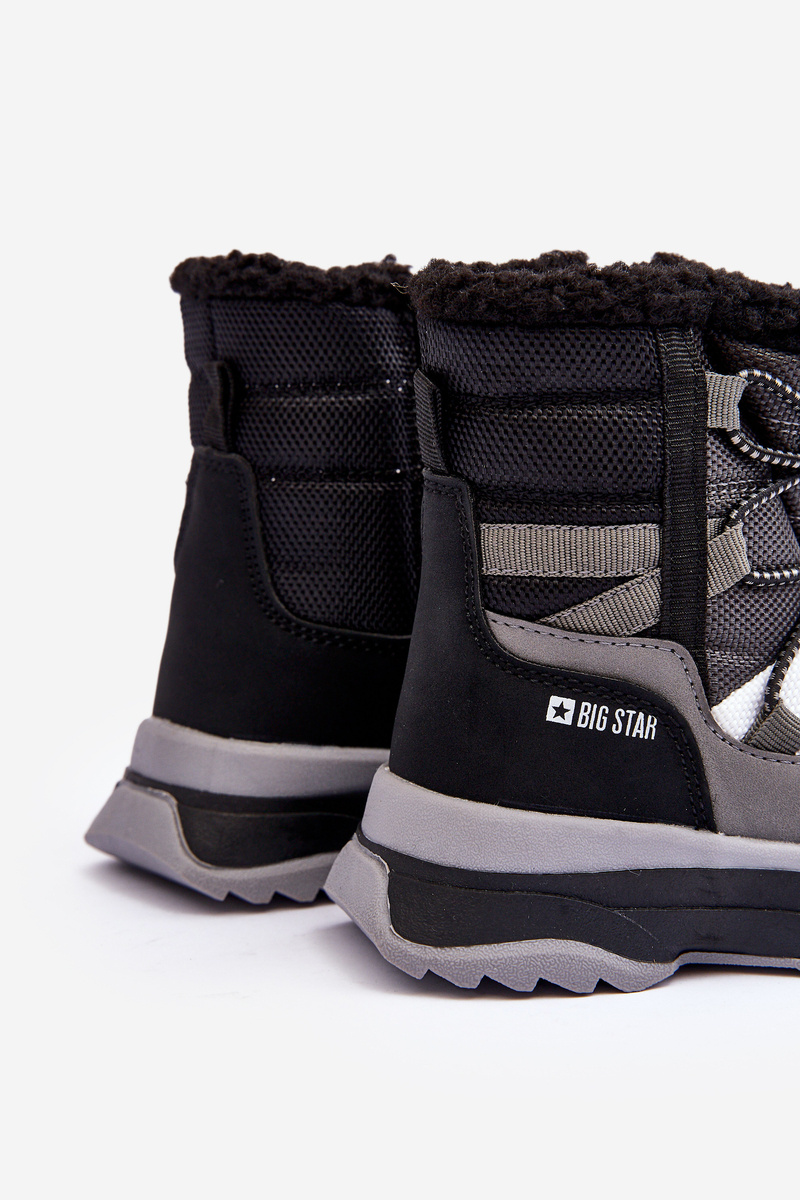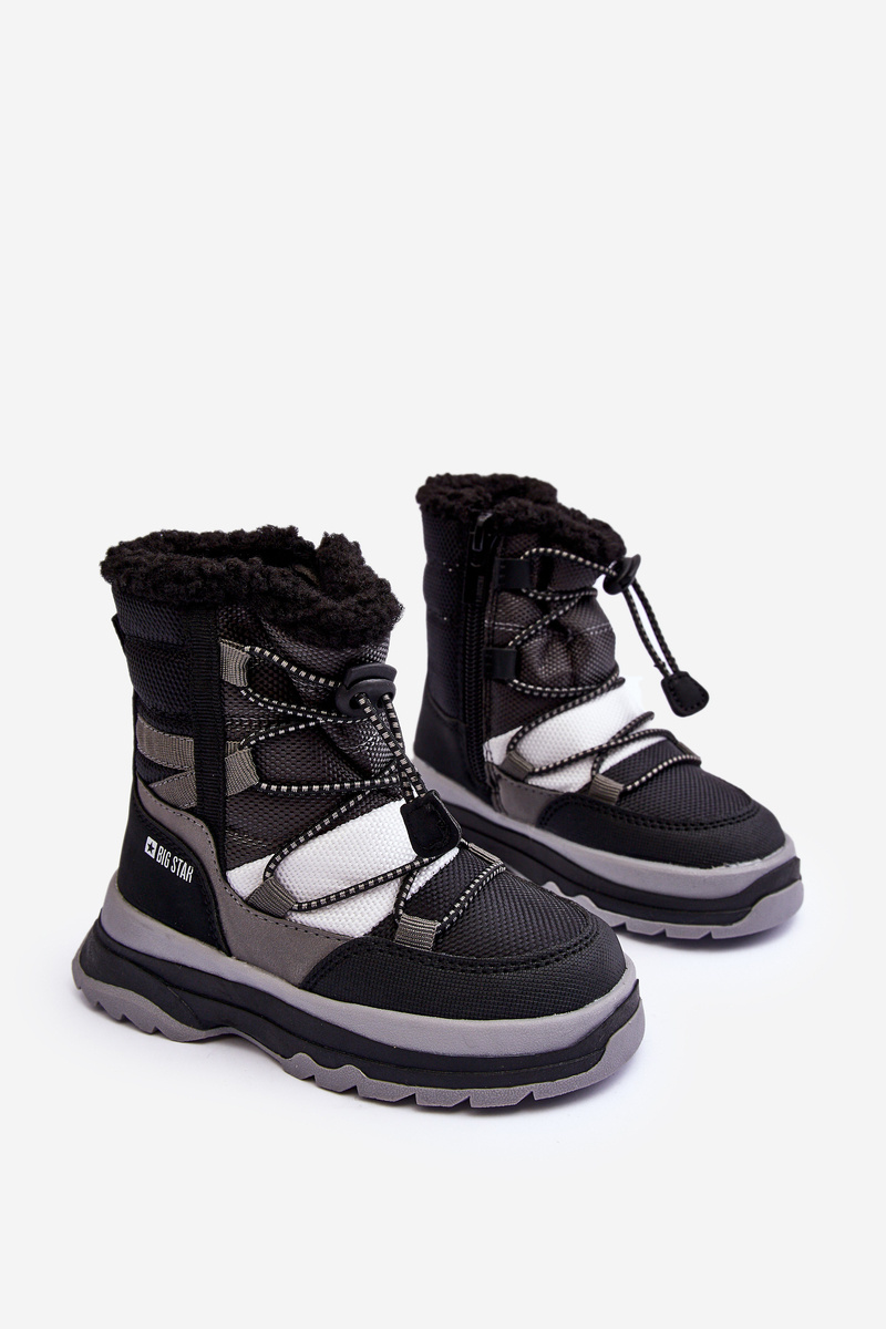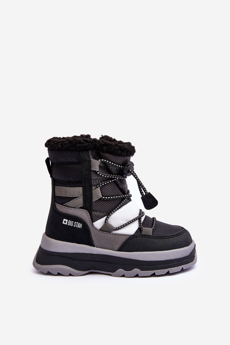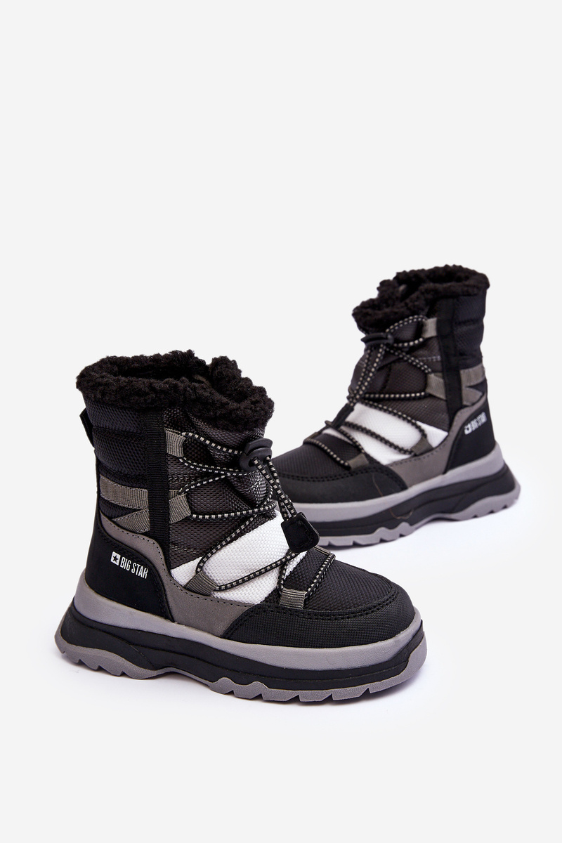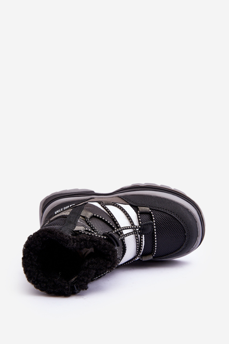 Detské snehové topánky od značky Big Star vyrobené z kombinácie textilného materiálu a ekologickej kože. Vrchná časť hornej časti zdobená kabátom ovčej kože. Nastavené na plošine, ktorá bude účinne chrániť pred studenou zemou. Agent izoloval prikrývku topánky. Tento model je pripevnený posúvačom na boku hornej časti a má tiež zvlnený. Perfektná zimná obuv pre vaše dieťa! Mali by byť v šatníku vášho dieťaťa! Pri výbere veľkosti nasmerujte tabuľku veľkosti. -18,5 cm