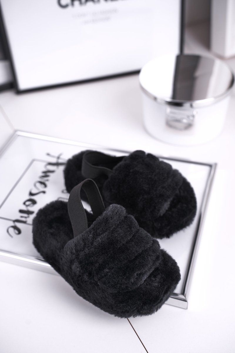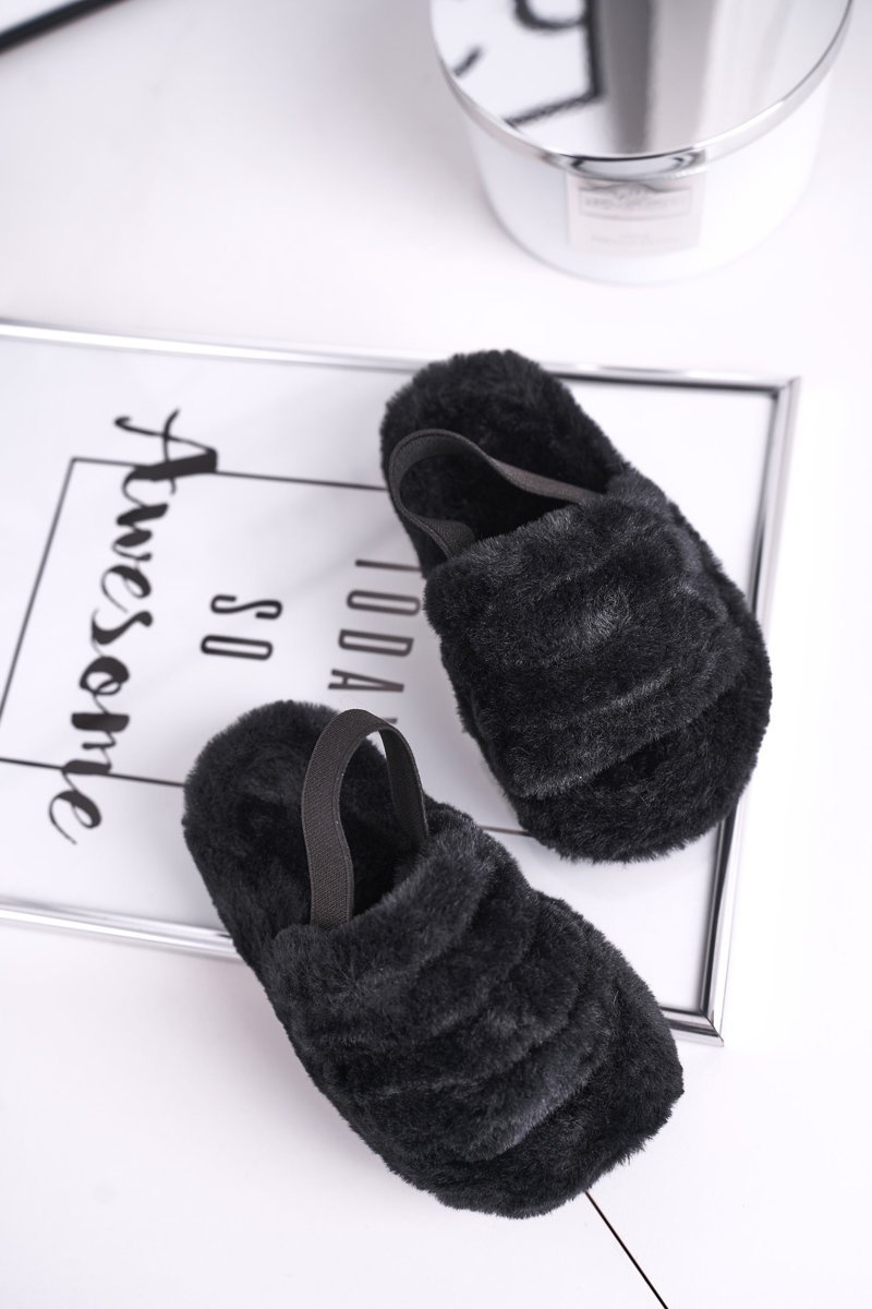 Detské žabky s kožušinou a elastickou čiernou nadýchanou