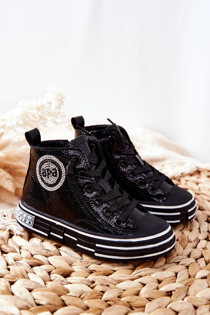 Krásne lakované tenisky s dekoratívnym znakom duchov. Tenisky sú vyrobené z vysoko kvalitnej ekologickej kože, zatiaľ čo vložka prírodnej kože, ktorá je veľmi mäkká. Topánky majú podrážku. Majú dlhopisy a posúvač. Pri výbere veľkosti nasmerujte tabuľku veľkosti.