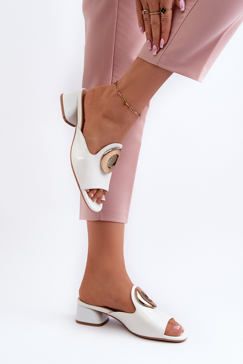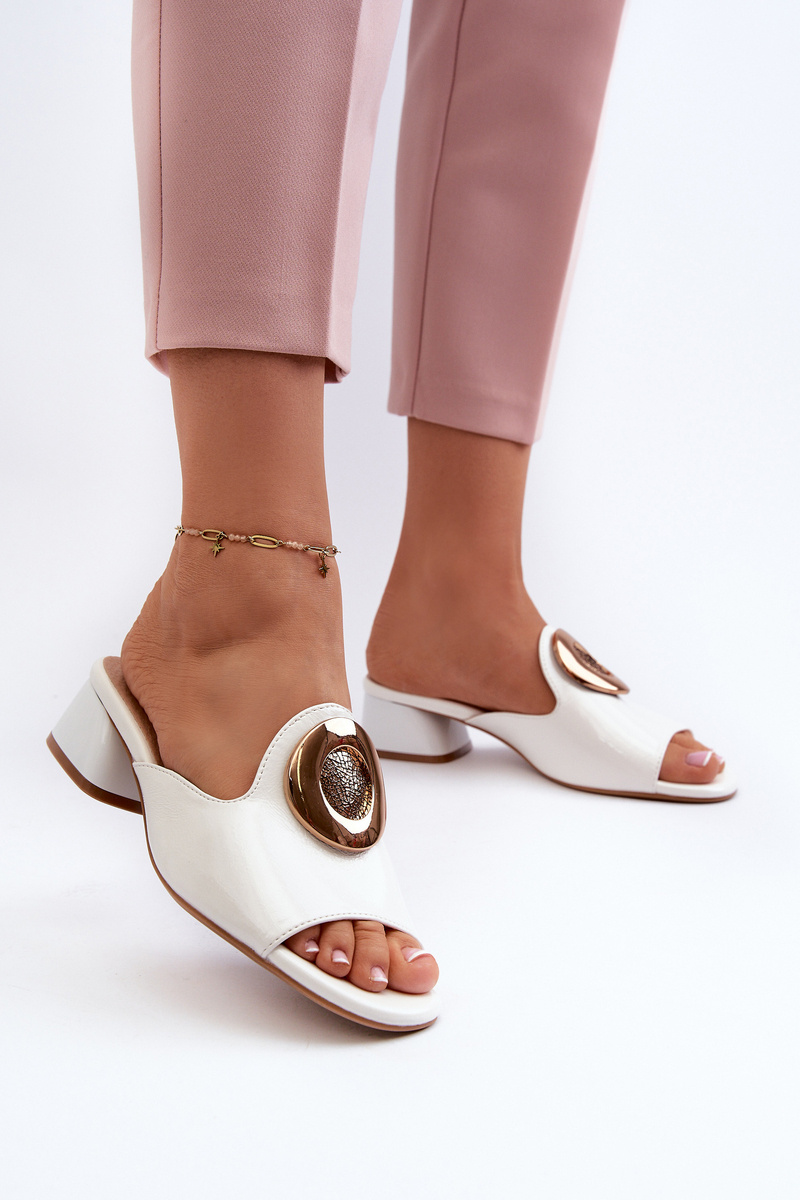 Elegantné lakové dámske papuče na nízkom podpätku so zlatou ozdobou biele Uzimila