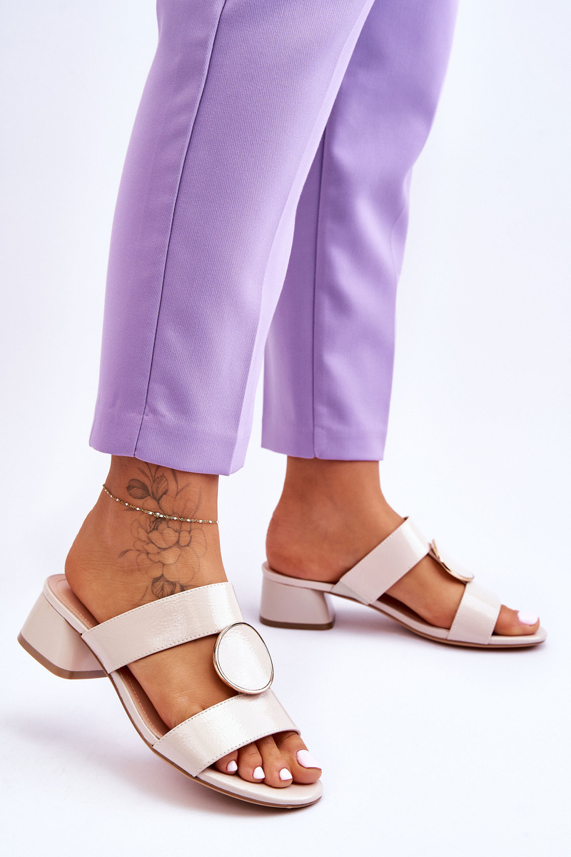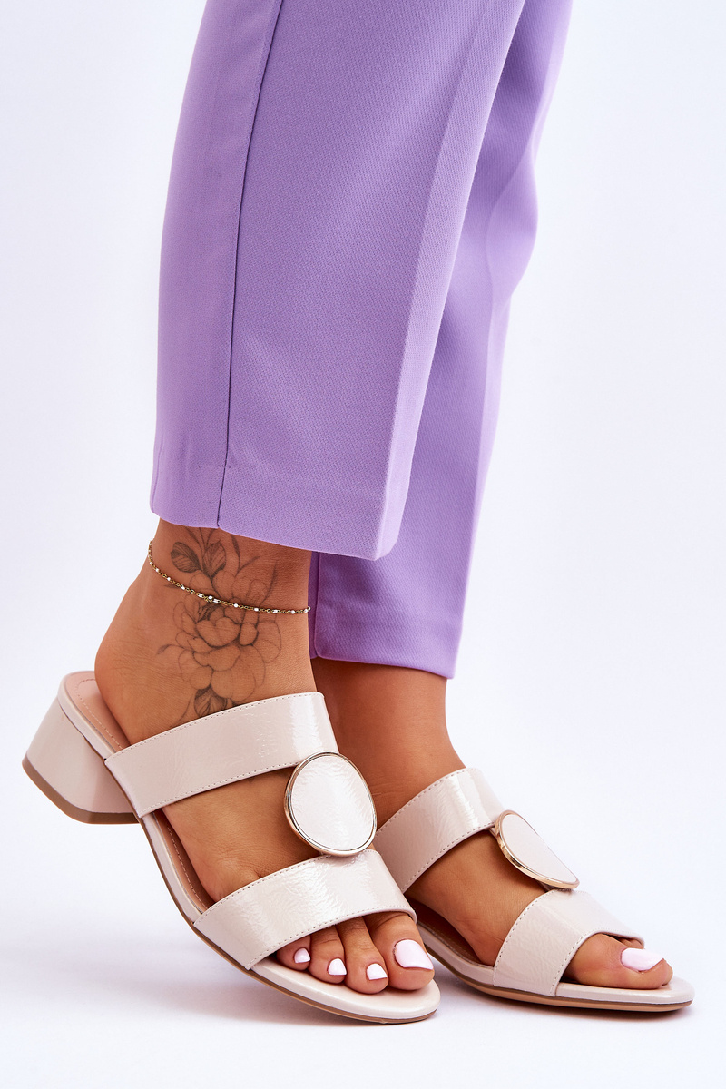 Elegantné žabky žien boli vyrobené z ekologickej kože. Tento model je zabudovaný na päty vo forme bloku. Majú dekoráciu medzi popruhmi v tvare kolies. Mäkká vložka poskytne pohodlie aj po celý deň a bola vyrobená z prírodnej kože. Módny, klasický strih s otvoreným, zaobleným nosom. Pri výbere veľkosti postupujte podľa tabuľky veľkosti.