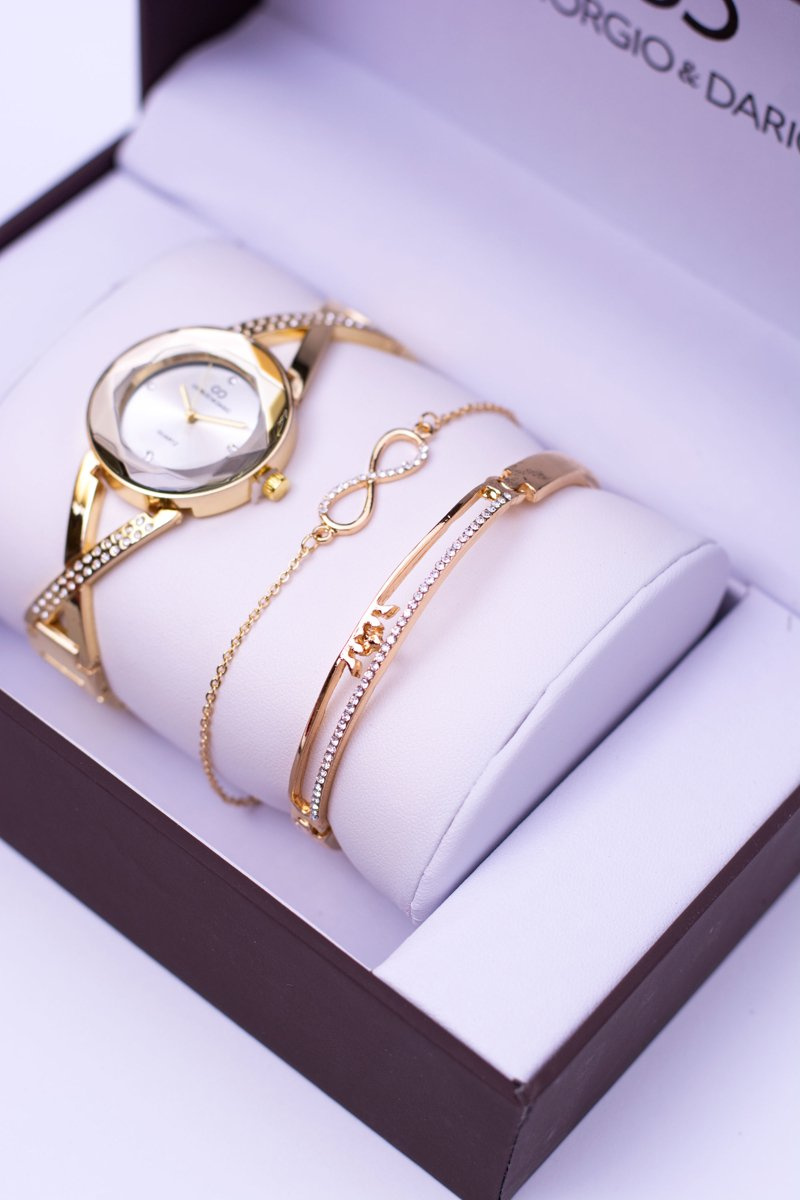 Elegantná a mimoriadne štýlová súprava od Giorgia Dario. Zlaté hodinky zdobené malými kryštálmi a dvoma štýlovými náramkami. Určite sa vám bude páčiť táto sada, perfektná súprava na darček! Všetko, čo je na obrázku, t. J. Hodinky, dva náramky a balenie.