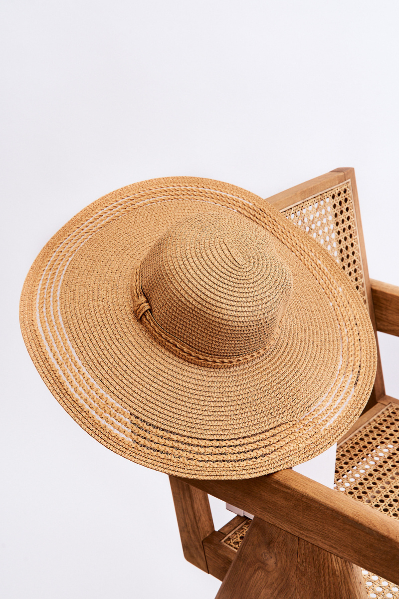 Klasický, hladký dámsky klobúk bol vyrobený zo 100% papiera. Kruhový objazd má priesvitný vzor. Na dekoráciu bol umiestnený klobúk. Okrem toho je vo vnútri stuha, ktorá umožňuje klobúku namontovať hlavu k hlave.
