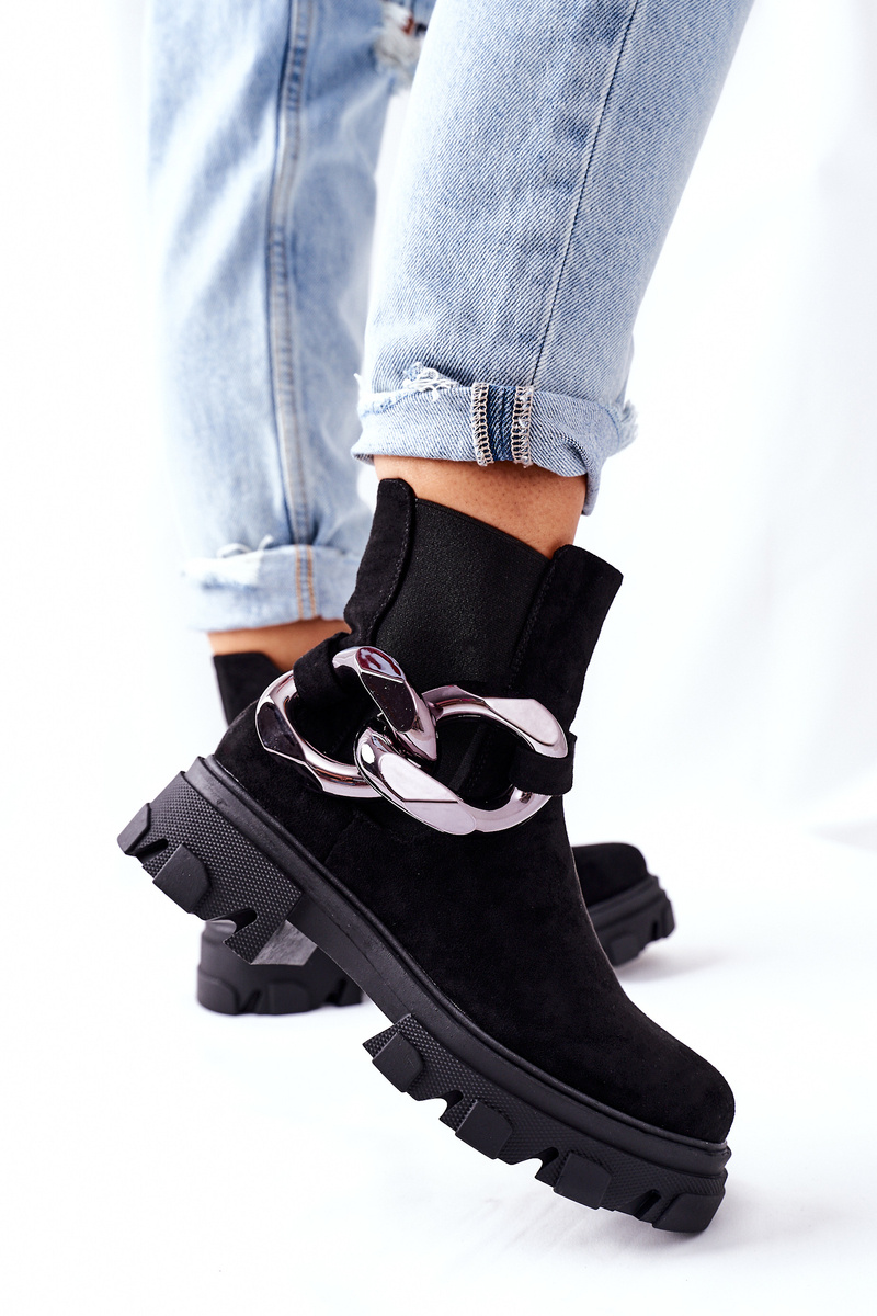 Dámske topánky Jodhpur vyrobené z ekologickej časti. Interiér topánok je pokrytý jemným otepľovaním vo forme peny. Nasaďte šitý posúvač, zatiaľ čo lepšie sa prispôsobí utiahnutím gumy. Horná časť zdobená veľkou reťazou, ktorá je hitom tejto sezóny. Dodávka sa môže rozbaliť. Pri výbere veľkosti navrhnite tabuľku veľkosti.