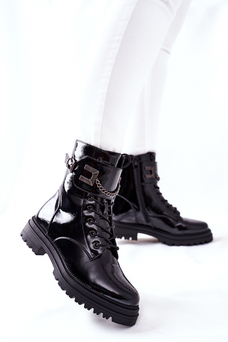 Pracovníci sú neoddeliteľným prvkom jesenných a zimných štylizovaní. Topánky vyrobené z lakovanej ekologickej kože, ktorá sa zmestí do každého módneho trendu. Uvedenie uľahčí posúvača šité na boku, zatiaľ čo dobrý záchvat bude vyrobený klasickým šnurovaním. Interiér je izolovaný teplým a príjemným na dotyk kožušiny. Pri výbere veľkosti navrhnite tabuľku veľkosti.