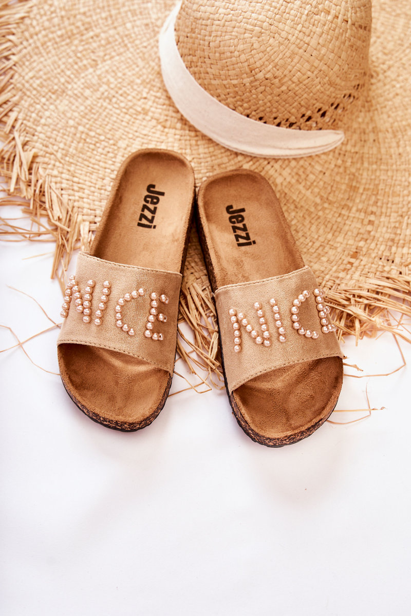 Dámske papuče v modernom prostredí! Vyrobené z ekologického semišu, ktorý sa má dotknúť. Klapky majú na prednej strane nápis z guľôčok. Vložka je profilovaná a vyrobená z ekologického semišu. Pliséry nastavené na platforme Cork. Nos objavený, zaoblený. Tieto žabky sa dobre prispôsobujú nohám. Tieto topánky sú skutočne pohodlné a pohodlné na použitie aj počas používania po celý deň! Pri výbere veľkosti navrhnite tabuľku veľkosti. p>
