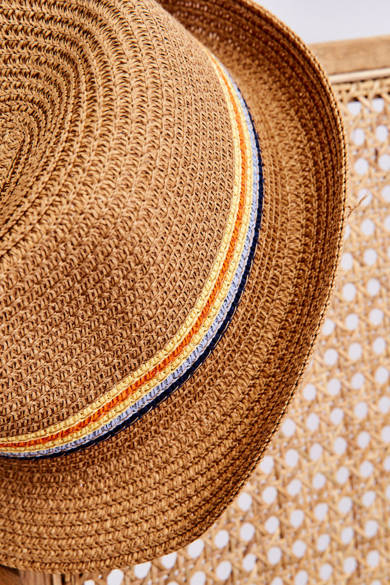 Detský klobúk s nepravidelným kruhovým objazdom bol vyrobený zo 100% slamy. Klobúk má na korune dekoratívne slamené pruhy. Vo vnútri je remienok, ktorý umožňuje klobúku namontovať hlavu k hlave hlavy. Perfektný model pre slnečné dni!