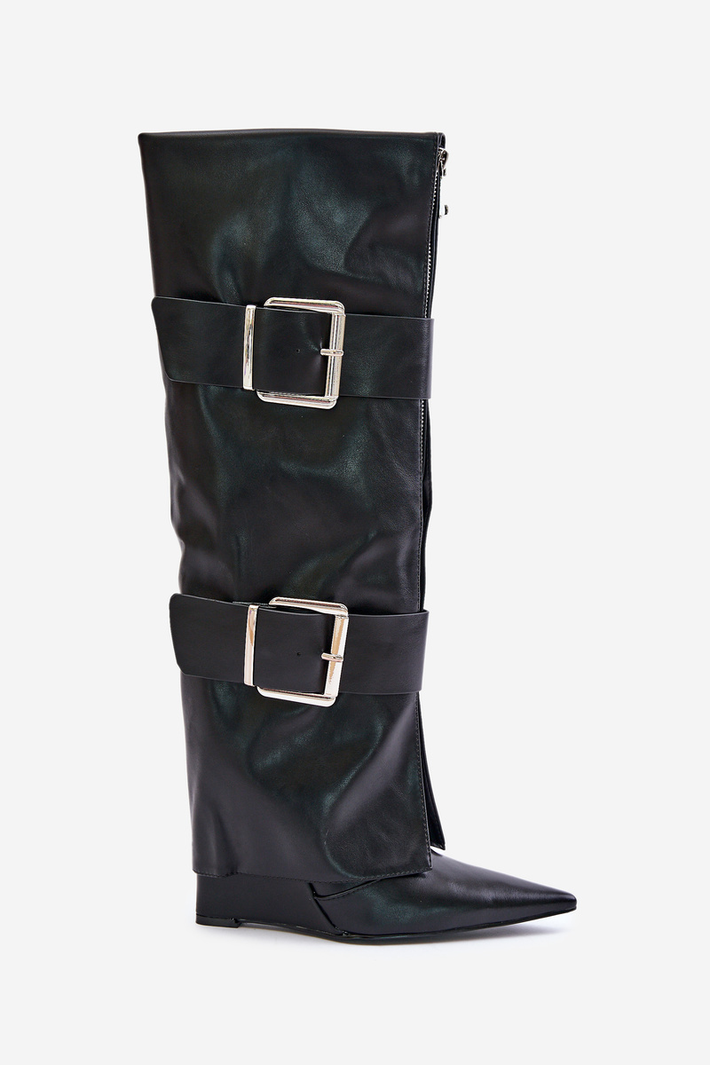Štýlové dámske čižmy vyrobené z eko kože. Uložené na platforme. Špicaté špičky. Vnútro je zateplené obuvníckou dekou. Hlavnou výhodou tohto modelu je prevrátená lýtko zdobená veľkými sponami a nezatvárateľným zipsom. Ideálne pre šaty alebo sukne! Určite by si ich mala mať! Při výběru velikosti se řiďte tabulkou velikostí.