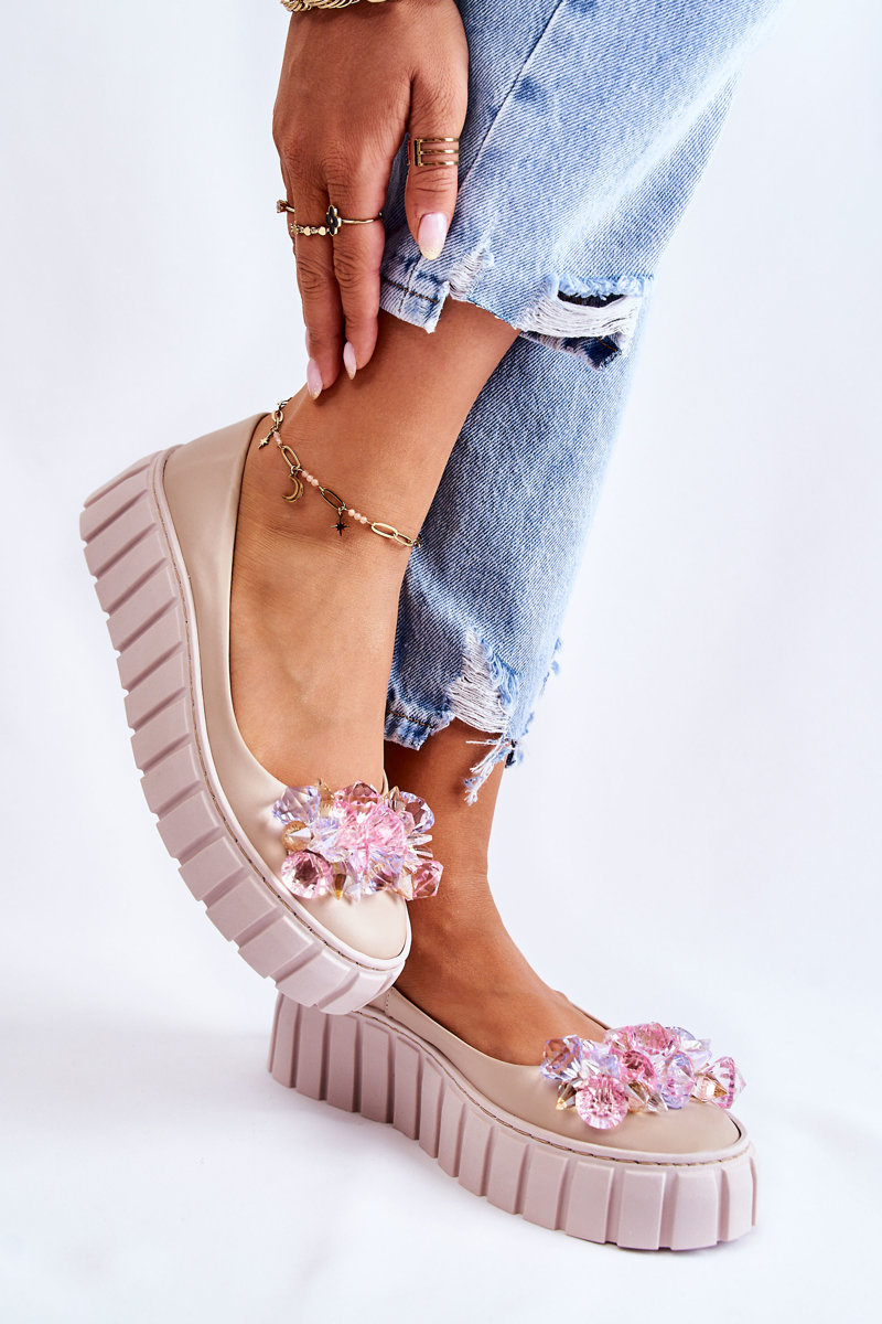 Kožené baleríny na plošine s farebnou béžovou dekoráciou Ladette