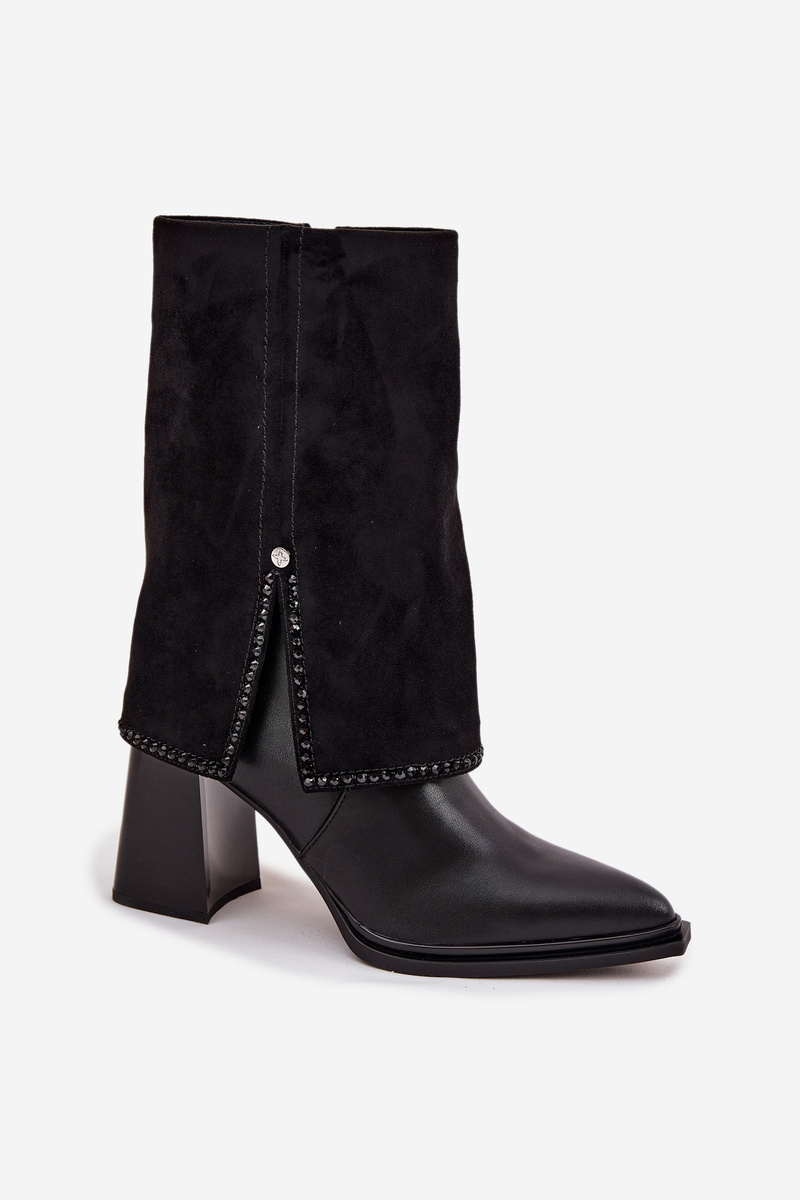 Kožené dámske členkové topánky na podpätku s preklopenou špičkou vyhrievané Maciejka K7206-01 Čierne
