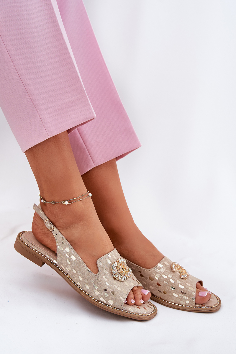 Kožené Sandále S Dekoráciou Na Ploškom Opätku S.Barski KV51-096 Zlaté