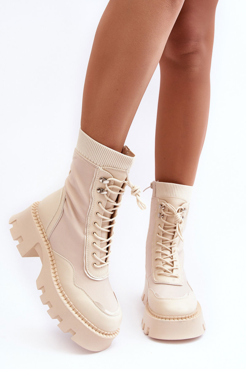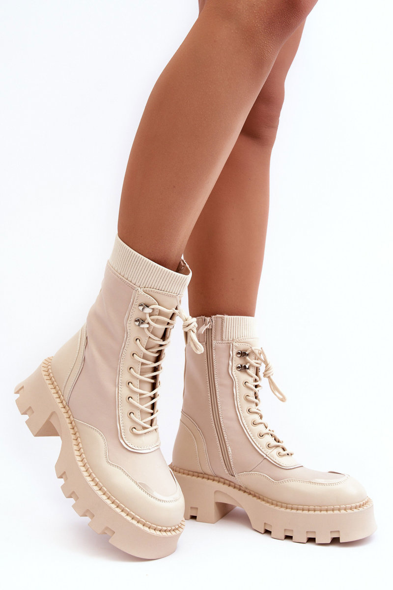 Dámske pracovníčky zabudované na masívnej plochej päte a platforme. Vyrobené z kombinácie ekologickej kože a textilného materiálu. Čipka -up a navyše pripevnená zipsom na vnútornej strane hornej časti. Zaoblené prsty na nohách. Agent izoloval prikrývku topánky. Pozrite sa na celú našu kolekciu vysokých topánok! Pri výbere veľkosti navrhnite tabuľku veľkosti.