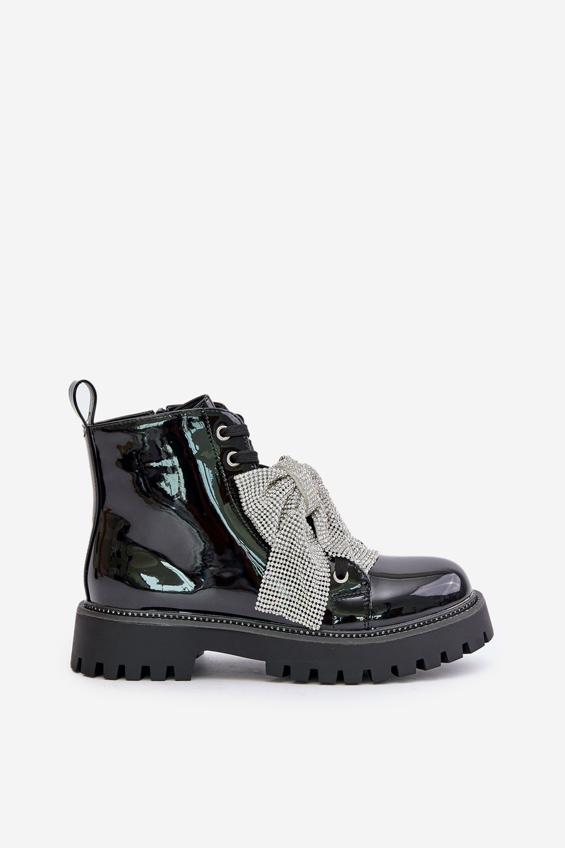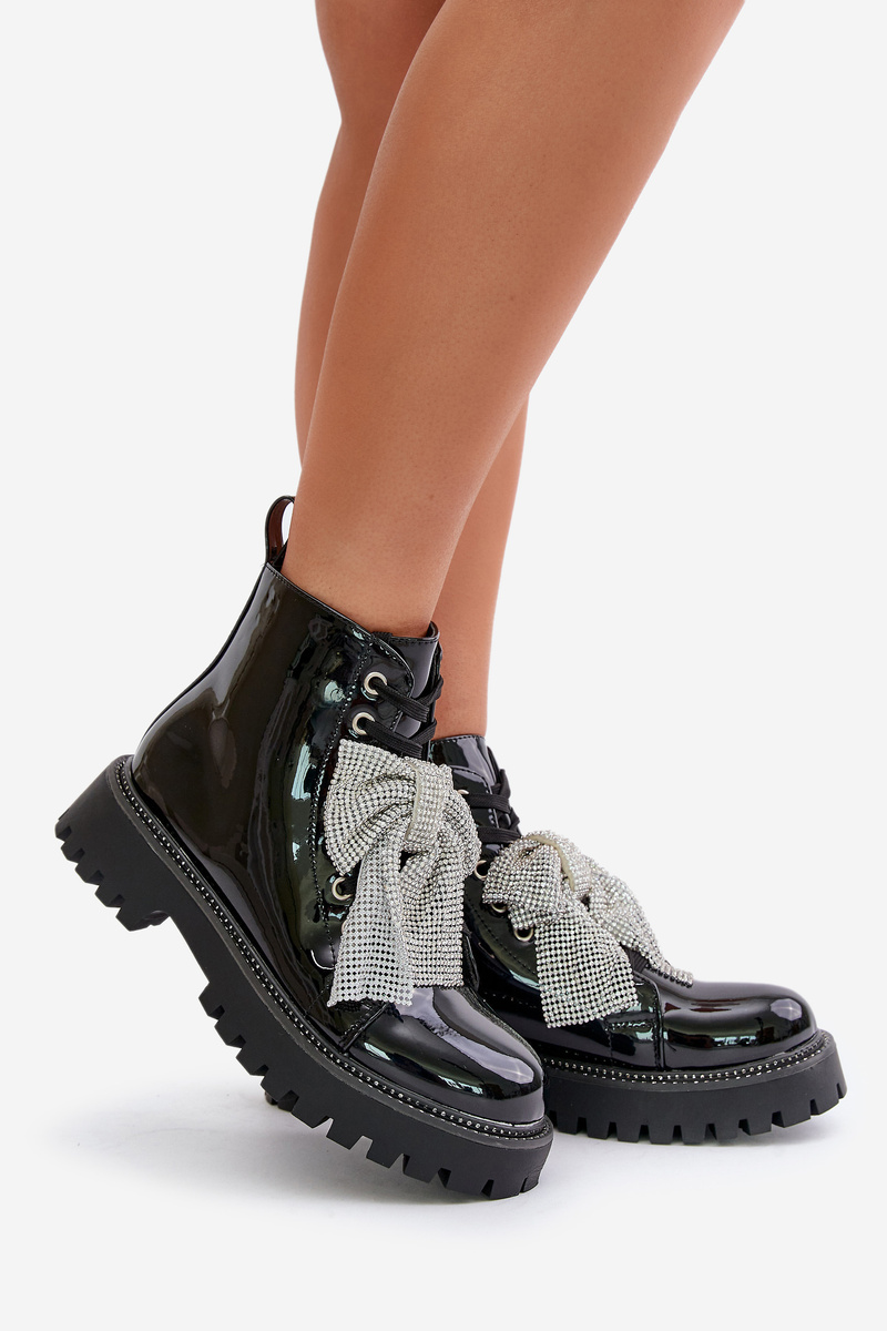 Čižmy na plochom podpätku kombinujú pohodlie a štýl, perfektne sa hodia do každodenných a výnimočných outfitov. Zaoblené špičky im dodávajú klasický vzhľad. Zapínanie na zips uľahčuje rýchle obúvanie, zatiaľ čo dodatočné šnurovanie umožňuje dokonalé prispôsobenie nohe. Hlavnou výhodou tohto modelu je mašľa s kryštálmi umiestnená vpredu, ktorá pridáva elegantný a ženský akcent, priťahuje pohľady a zdôrazňuje jedinečnosť tejto obuvi. Při výběru velikosti se řiďte tabulkou velikostí.