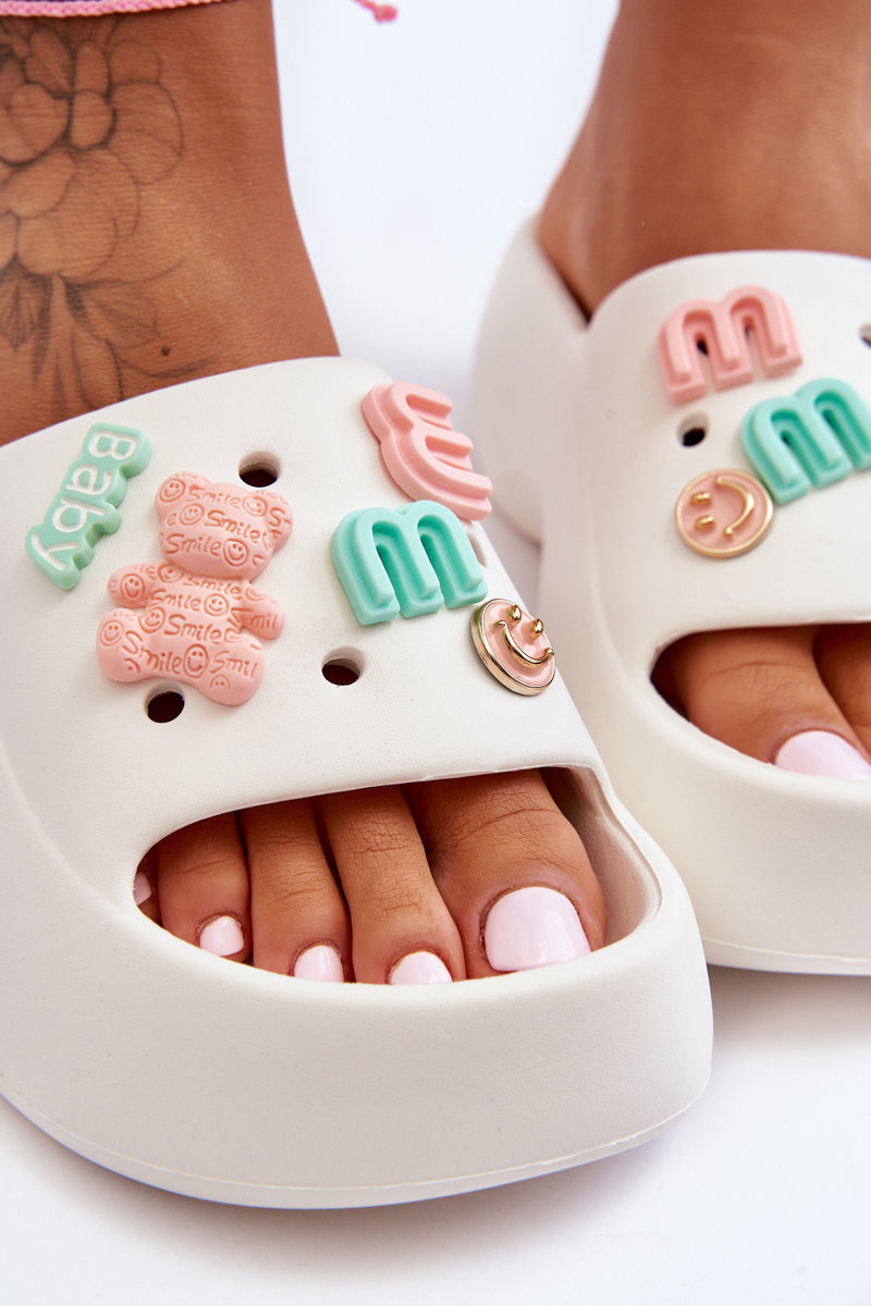 Štýlové, mäkké, dámske papuče boli vyrobené z penového plastu. Tento model bol nastavený na masívnu platformu. Topánky sú veľmi ľahké a majú vpredu farebné dekorácie. Ideálne pre letnú sezónu, mimoriadne vzdušný a pohodlný. Pri výbere veľkosti navrhnite tabuľku veľkosti.