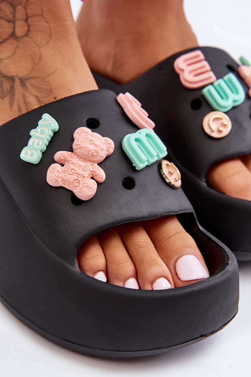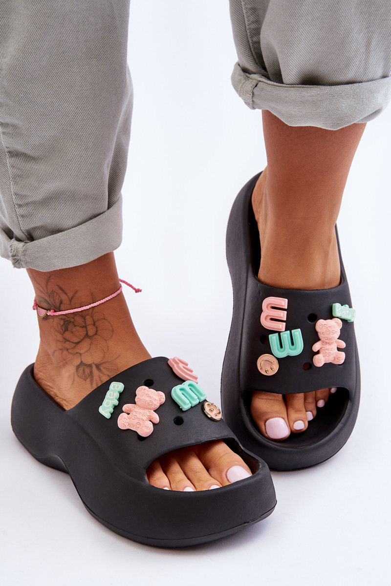Mäkké dámske penové flops s čiernymi dekoráciami