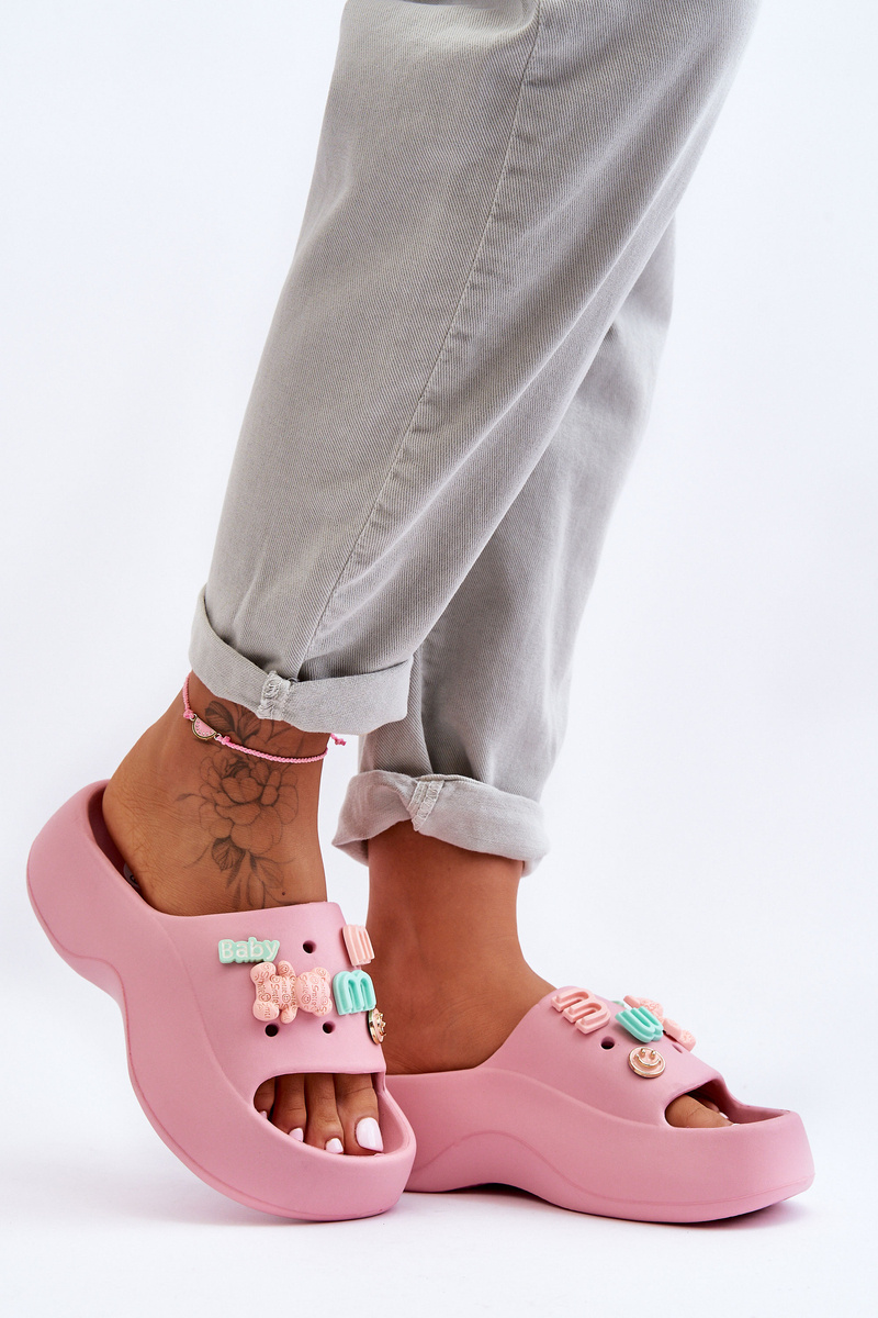 Štýlové, mäkké, dámske papuče boli vyrobené z penového plastu. Tento model bol nastavený na masívnu platformu. Topánky sú veľmi ľahké a majú vpredu farebné dekorácie. Ideálne pre letnú sezónu, mimoriadne vzdušný a pohodlný. Pri výbere veľkosti navrhnite tabuľku veľkosti.