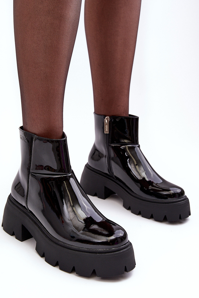 Goe Boots. Vyrobené z vysoko kvalitnej lakovanej prírodnej kože. Miešené na masívnej plochej päte a hustej podrážke. Pripevnený posúvačom na boku. Stred je mierne izolovaný. Stuhnuté. Zaoblené prsty na nohách. Ideálne pre jesenné štylizácie. Pri výbere veľkosti postupujte podľa tabuľky veľkosti