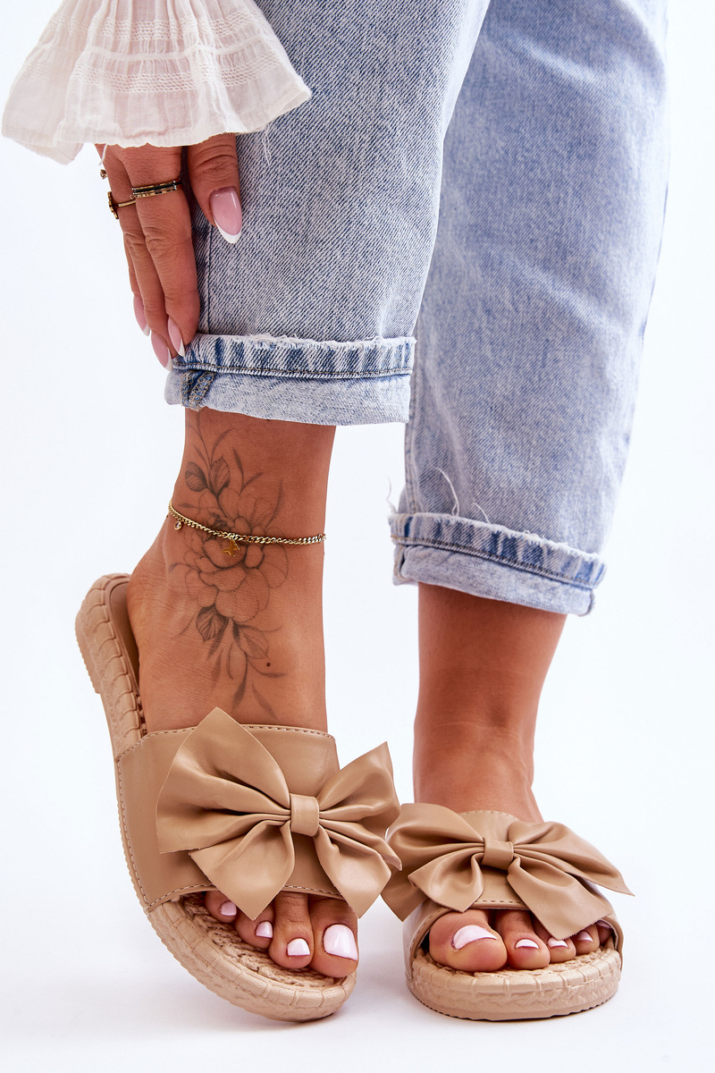 Classic, Slip -up Dámske žabky boli vyrobené z ekologickej kože. Okrem toho majú vpredu očarujúci luk. Vložka a podrážka sú vyrobené z gumového plastu. Patríky sa pohodlne používajú, ako aj flexibilné. Žabky sú umiestnené na plochej päte. Pri výbere veľkosti navrhnite tabuľku veľkosti.