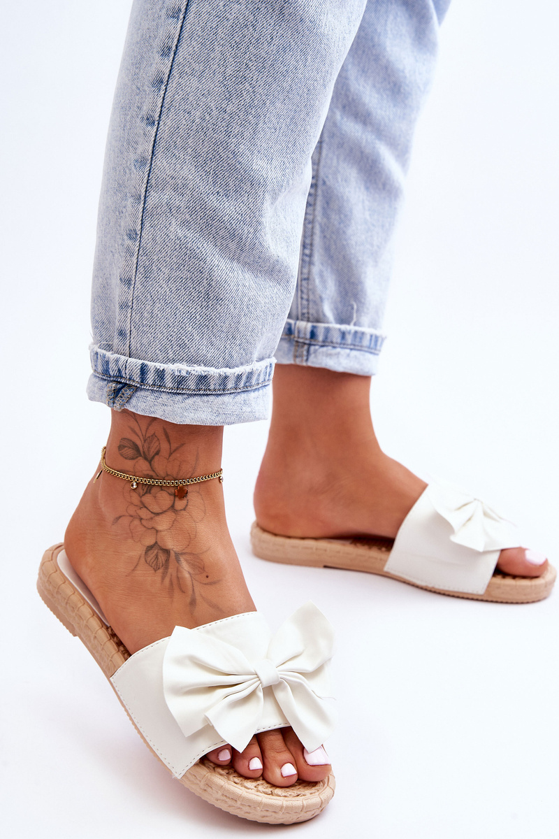 Classic, Slip -up Dámske žabky boli vyrobené z ekologickej kože. Okrem toho majú vpredu očarujúci luk. Vložka a podrážka sú vyrobené z gumového plastu. Patríky sa pohodlne používajú, ako aj flexibilné. Žabky sú umiestnené na plochej päte. Pri výbere veľkosti navrhnite tabuľku veľkosti.