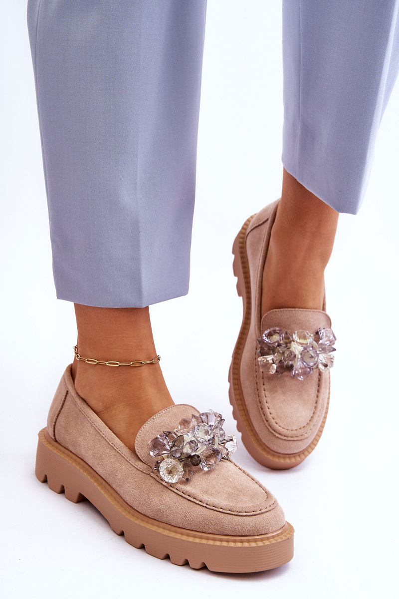Módne semišové mokasíny s kryštálmi béžový demeris
